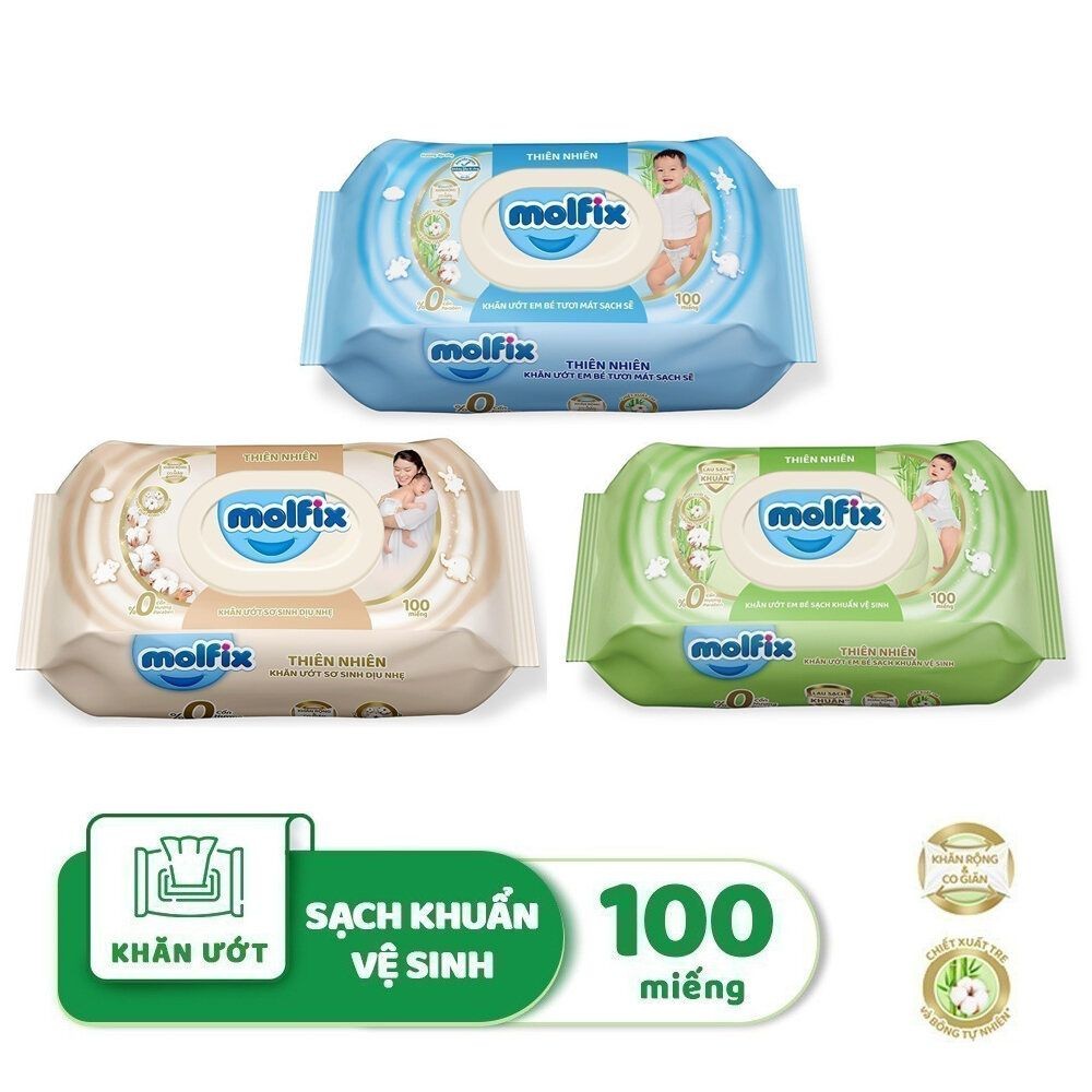 Khăn ướt Molfix thiên nhiên sạch khuẩn dịu nhẹ tươi mát với bông Organic tự nhiên 100 tờ