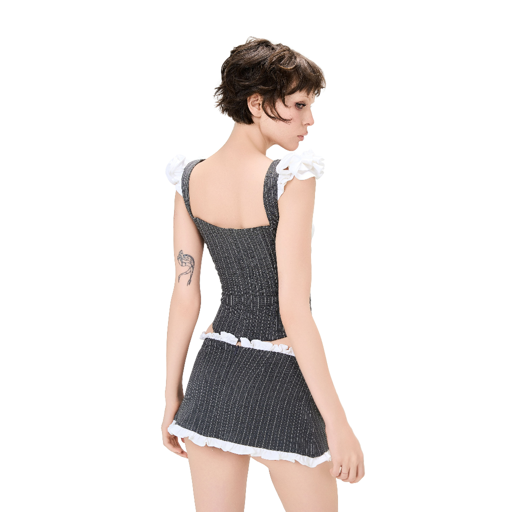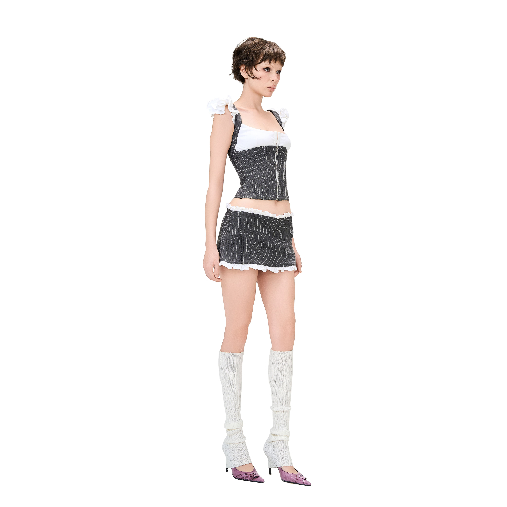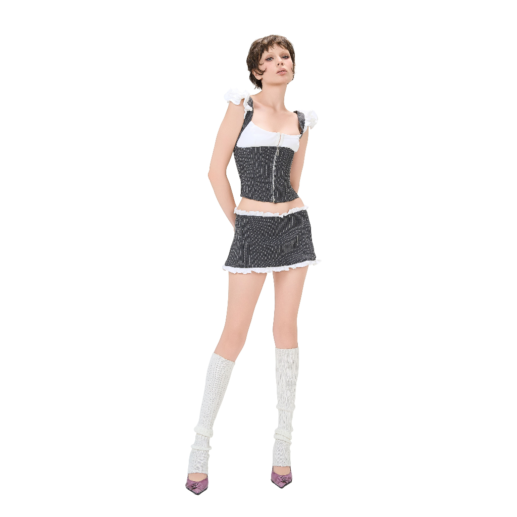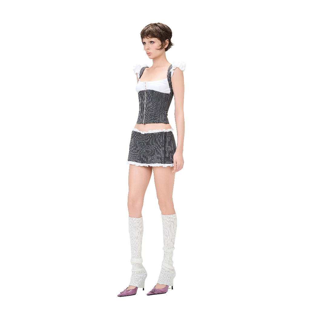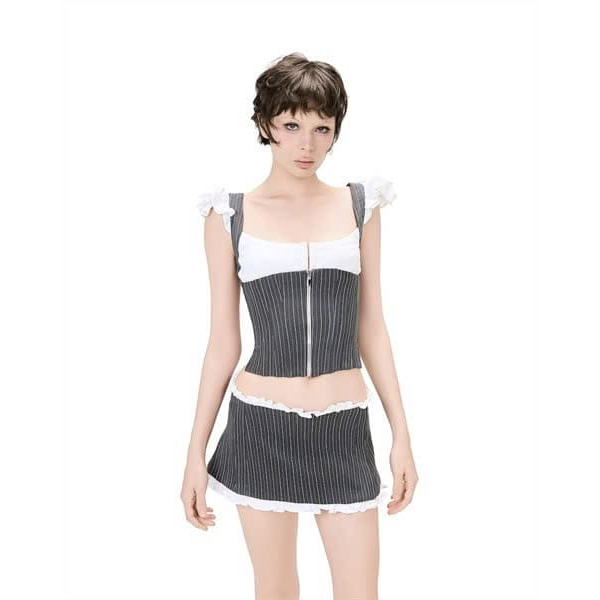 MbmumProject Yinny Set Áo Corset Phối Khóa và Chân Váy Ngắn Viền Ren Họa Tiết Sọc Caro Đen