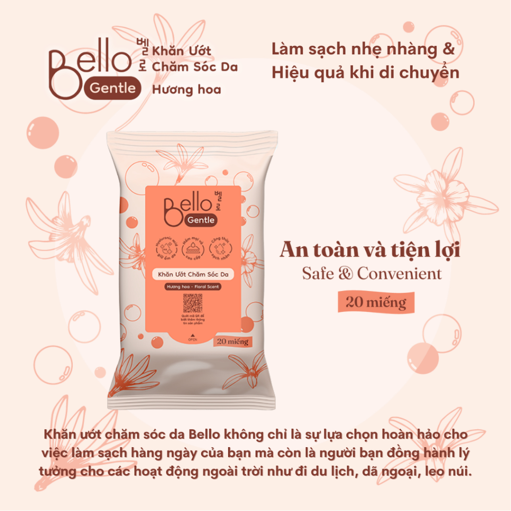 Combo 5, Combo 10 Gói Khăn Ướt 20 Tờ Bello Hương Hoa Chăm Sóc Tay, Mặt Không Cồn, Không Paraben