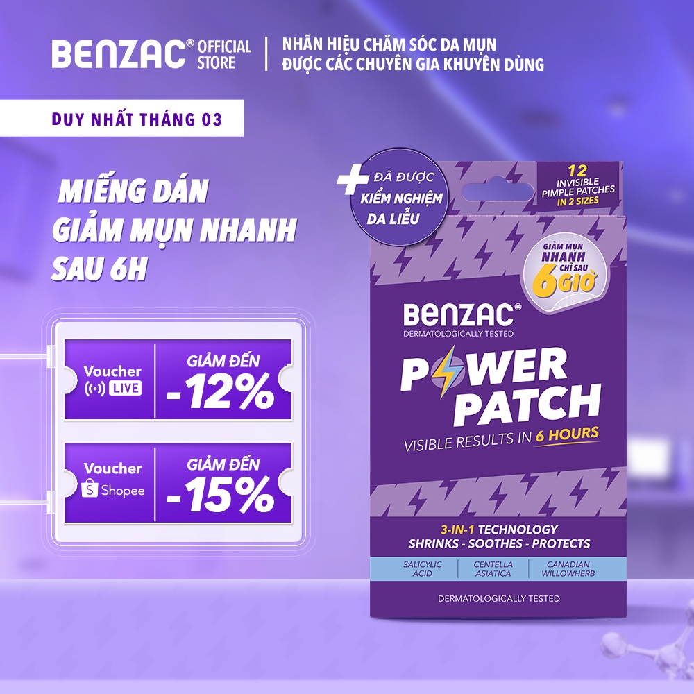 Miếng dán mụn 3 trong 1 BENZAC Power Patch x 12 miếng với Salicylic Acid