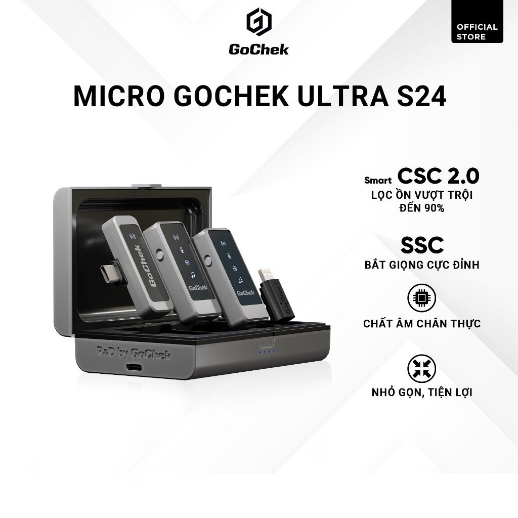 Micro thu âm không dây GoChek GC-ULTRA S24 kèm Hộp sạc lọc tạp âm khi live/video/ghi âm cho điện thoại/máy tính/ipad