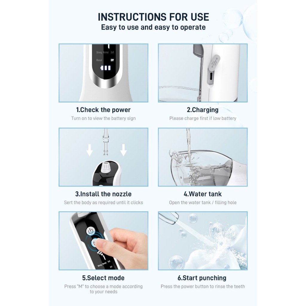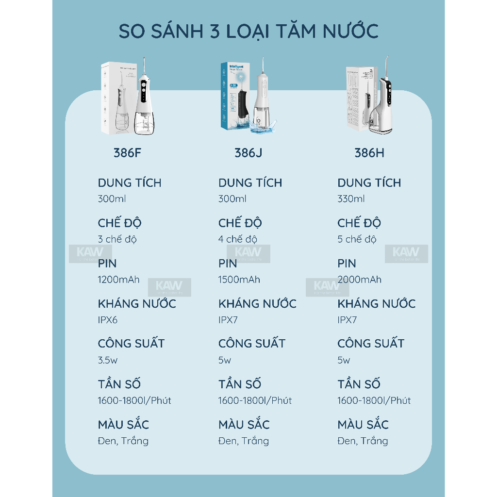 Máy tăm nước Kaw 386H - 5 Chế Độ Phun, Dung Tích 330ml, Kháng Nước IPx7, Kèm 5 Phụ Kiện