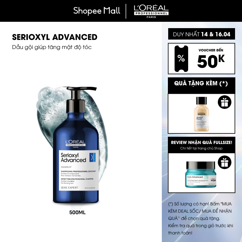 Dầu gội dưỡng tóc giúp làm dày tóc L'Oréal Professionnel Serioxyl Advanced 500ml - Dành cho tóc thưa, mảnh, rụng