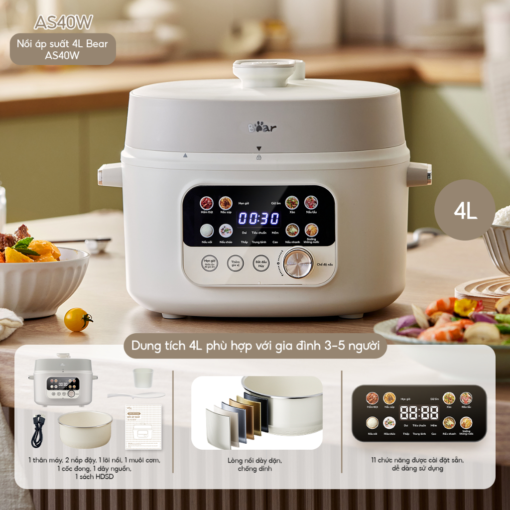 Nồi Áp Suất Điện 4L Bear Đa Năng 8 Chế Độ Ninh Hầm Lẩu Nướng Sôi Nhanh Chống Dính An Toàn Dễ Vệ Sinh SB-AS40W