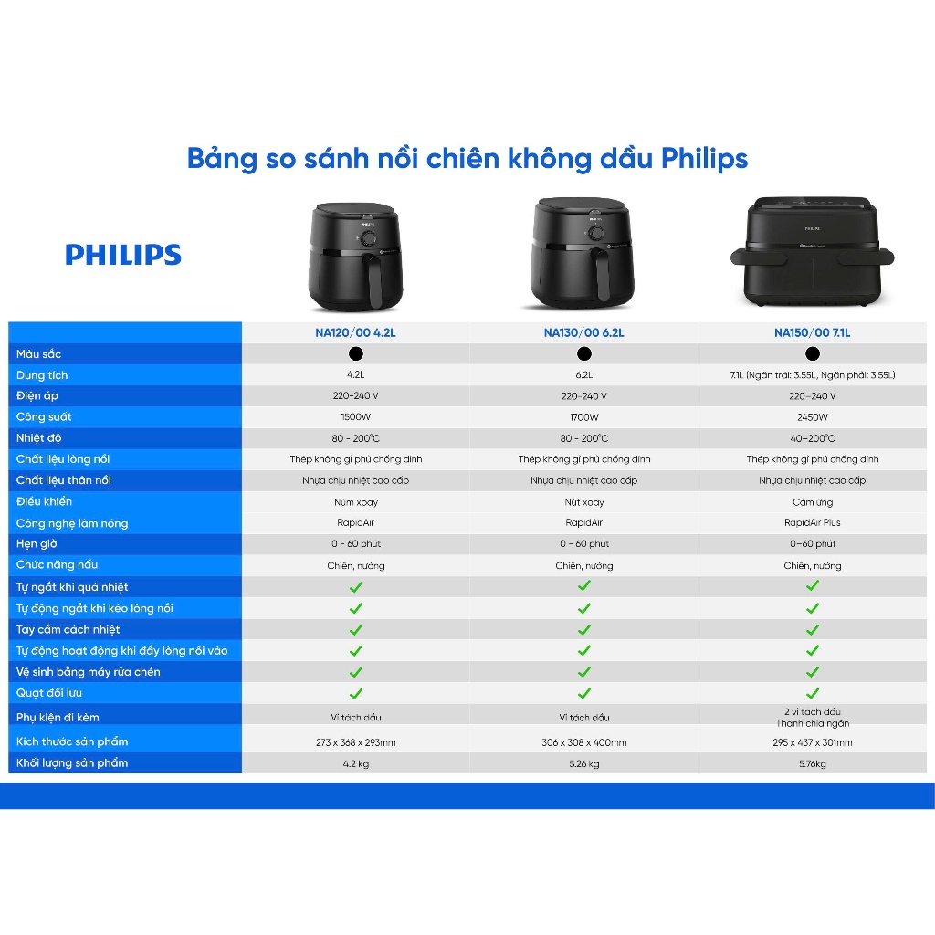 Nồi chiên không dầu Philips 6.2 lít NA130/00 - 4.2 lít NA120/00 - NA150/00 2 ngăn 7.1L, BH 24 THÁNG