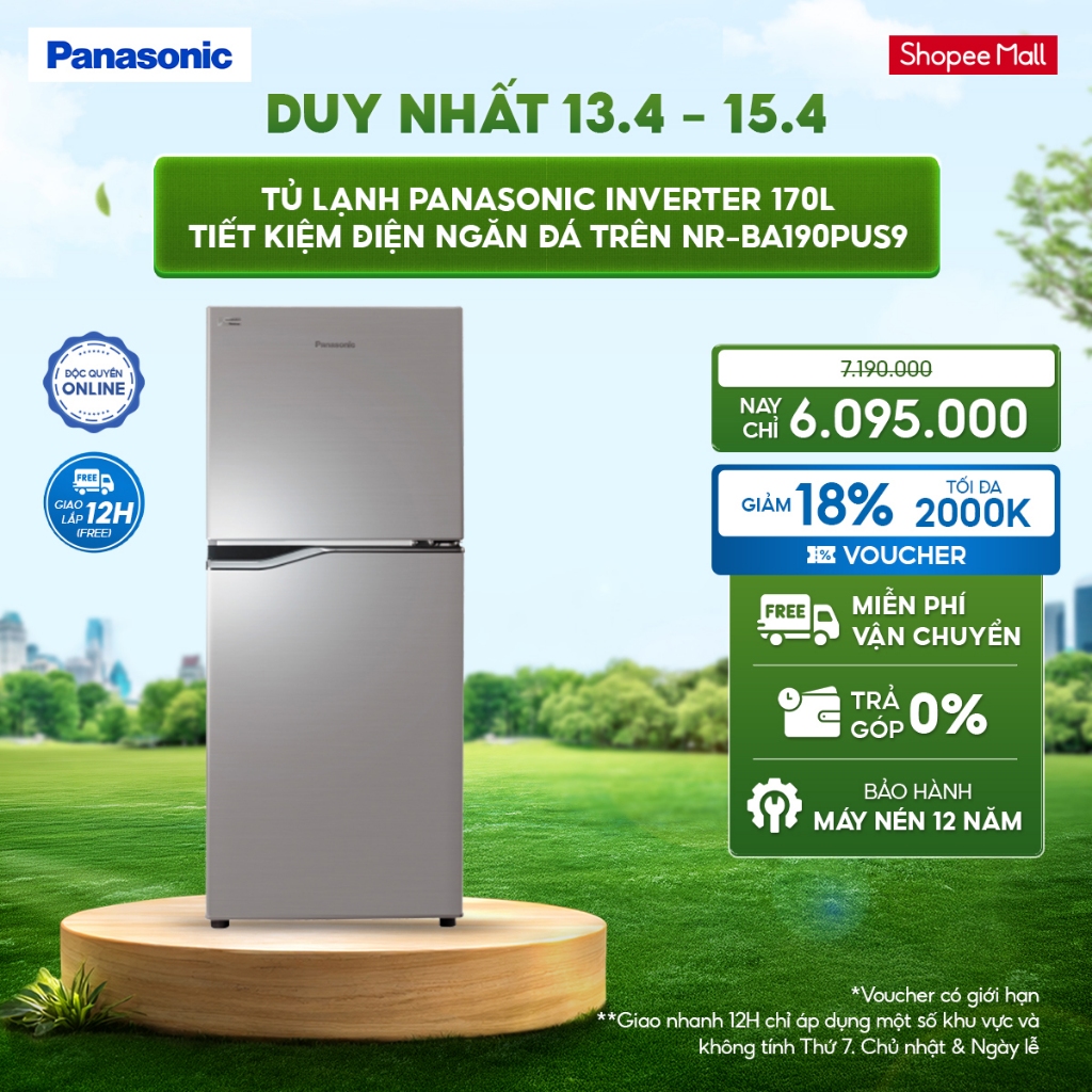[ELPN2TU GIẢM TỐI ĐA 2TR] [Chỉ giao miền Bắc] Tủ lạnh Panasonic Inverter 170lít Tiết kiệm điện Ngăn đá trên NR-BA190PUS9