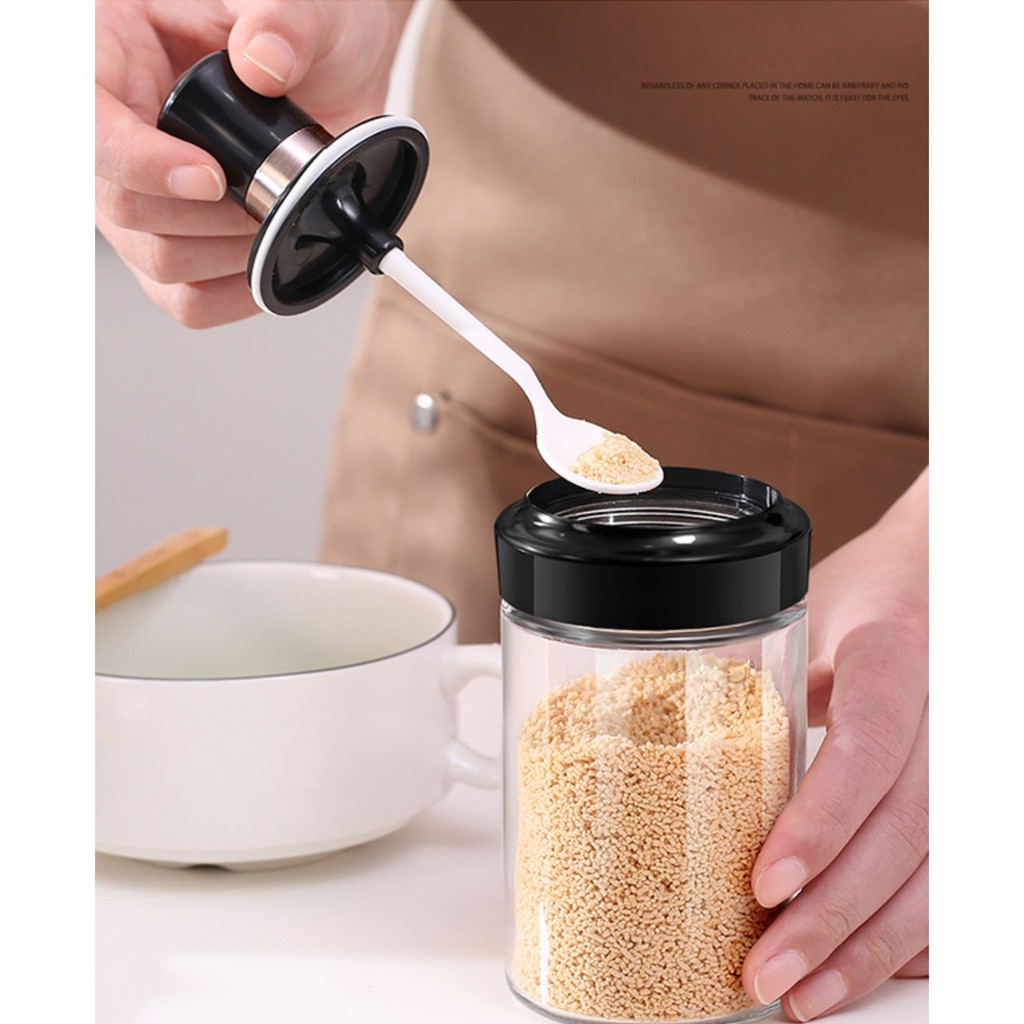 Hũ Đựng Gia Vị Kèm Muỗng Thuỷ Tinh Nắp Nhựa Đen