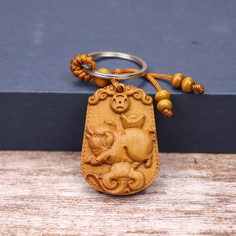 Móc Khoá Gỗ 12 Con Giáp, mặt sau ghi chữ bình an, tuổi con gì thì dùng con ấy