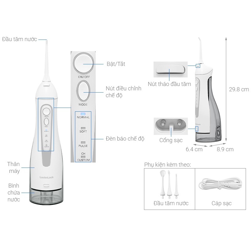 Máy tăm nước LocknLock 190ml Chính hãng, pin sạc, 3 loại đầu tăm vệ sinh răng miệng chuẩn nha khoa - HAPOS OFFICIAL