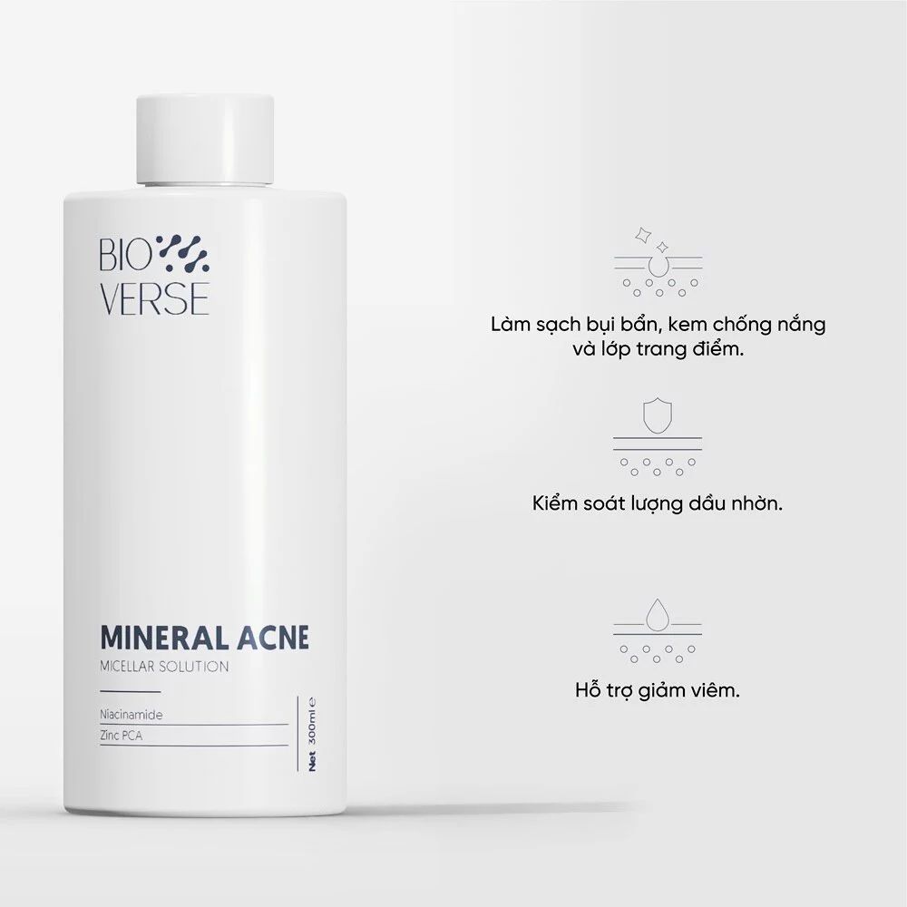 Nước tẩy trang Bioverse Mineral Acne Micellar Solution, Cicaporin Hydrating Micellar làm sạch, dịu nhẹ.