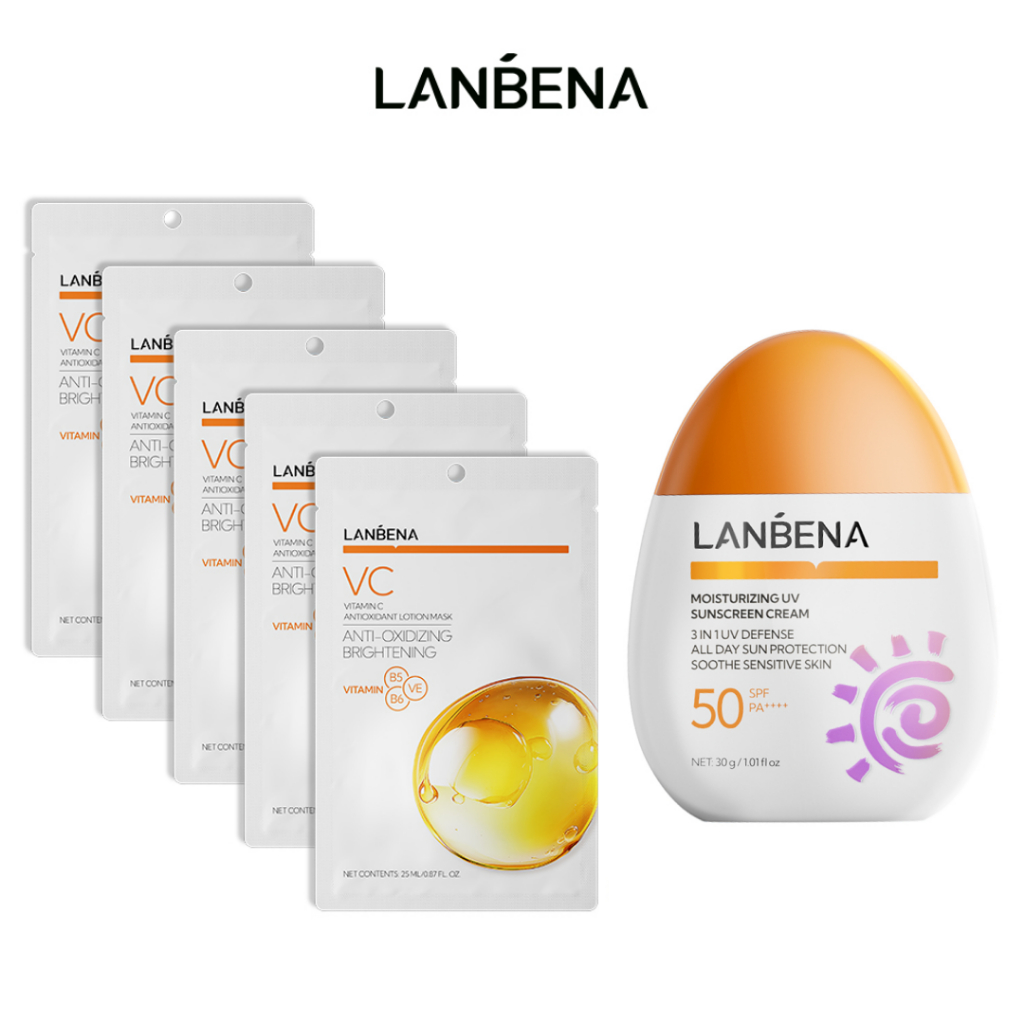 LANBENA Combo⚡️Kem chống nắng (30g+5pcs)UVB UVA SPF50+ PA++++ 30ml NGOÀI TRỜ CHỐNG NẮNG CAO CẤP CHO+5PCS MẶT NẠ DƯỠNG ẨM CHỐNG OXY HÓA VITAMIN C Skincare