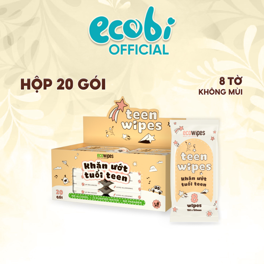 Hộp 20 gói khăn ướt mini size Teen Wipes gói 8 tờ không mùi
