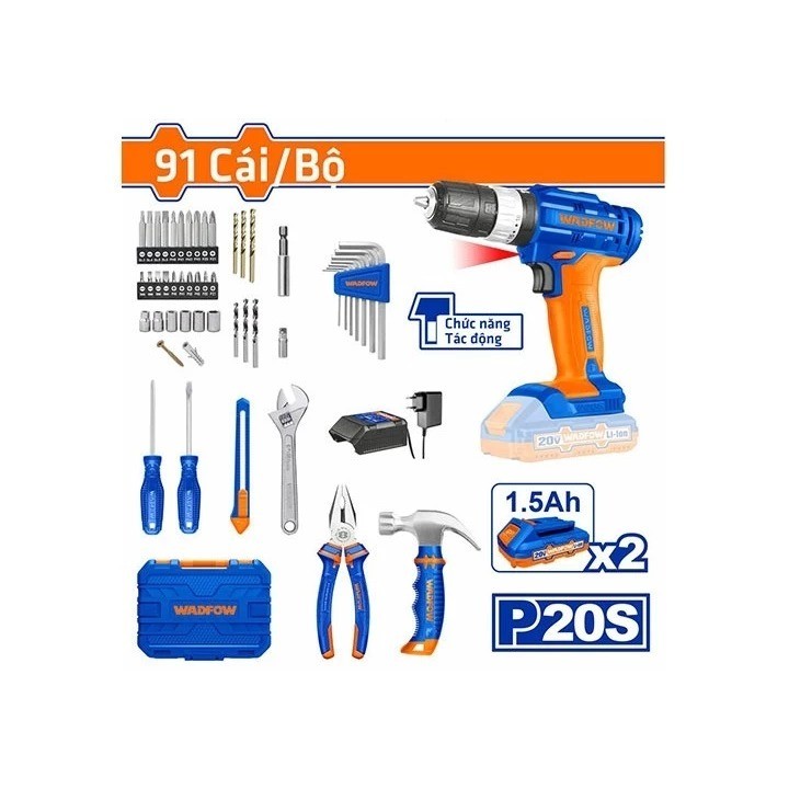 Bộ dụng cụ đa năng tiện lợi WADFOW WDT1B90 90 chi tiết kèm máy khoan pin 20V, 2 pin Xe Nâng Củ Chi