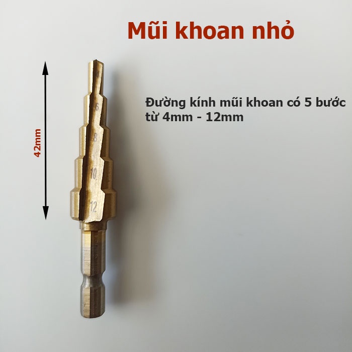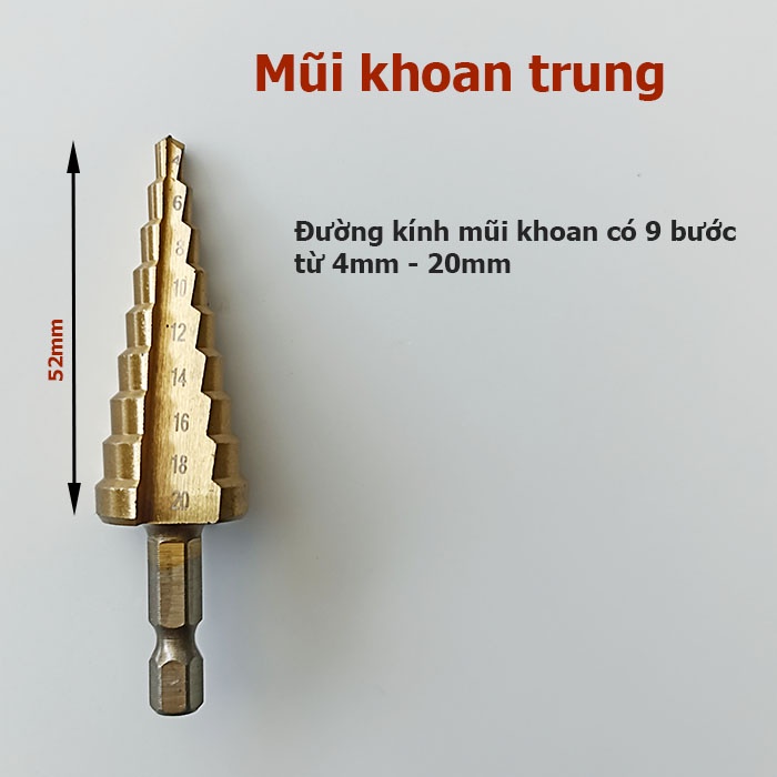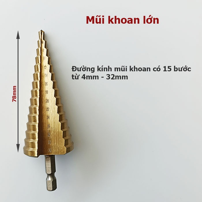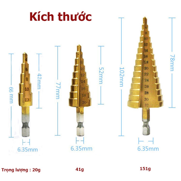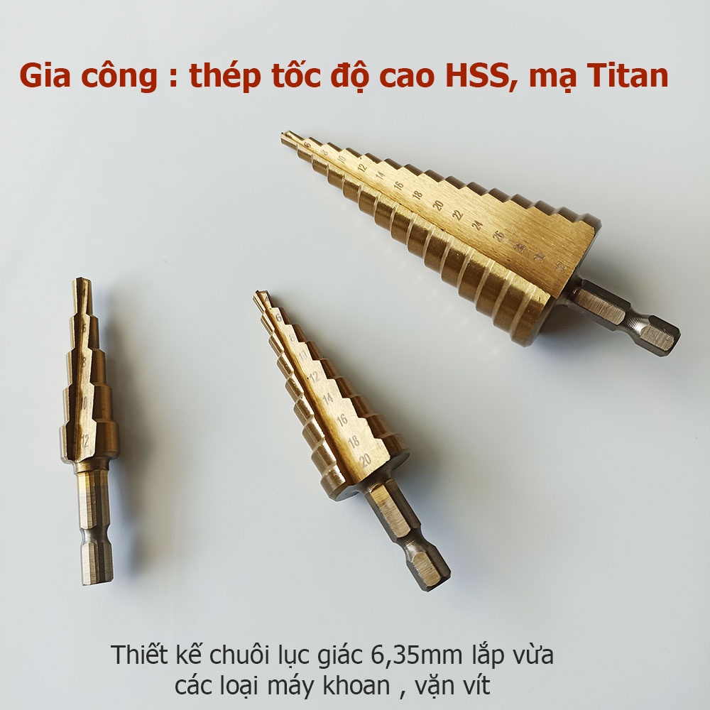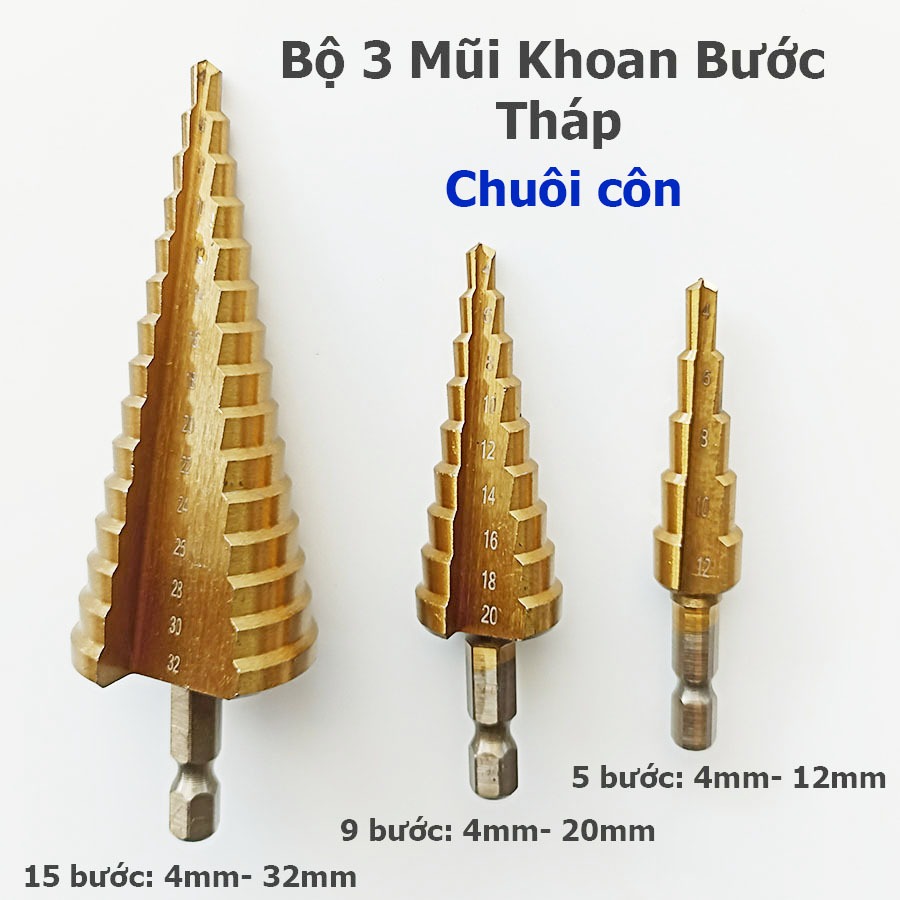 Bộ 3 Mũi Khoan Bước Tháp HSS 4241 Phủ Titan – Chuôi Lục Giác 6.35mm – Khoan Đa Kích Cỡ Từ 4–32mm