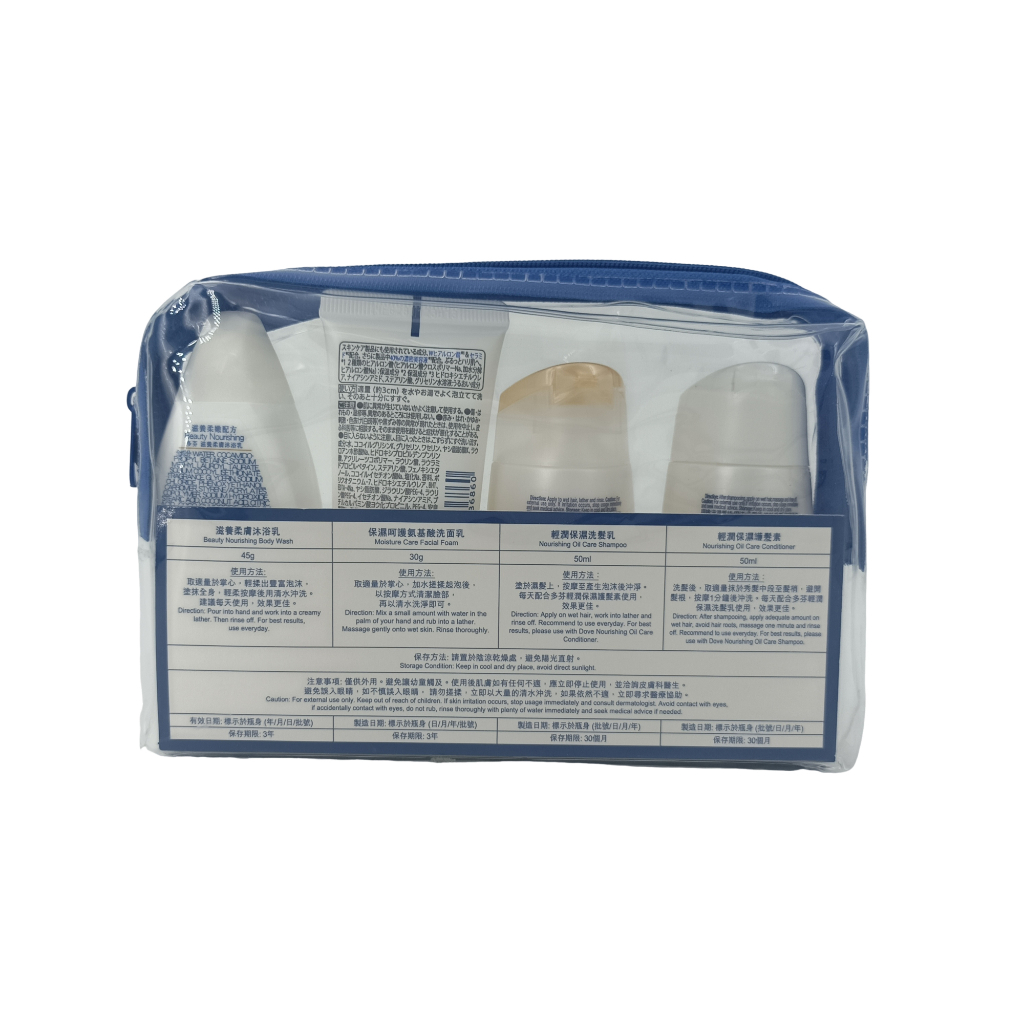 Dove Travel Set: Conditioner 50ml + Shampoo 50ml + Facial Foam 30g + Body Wash 45g