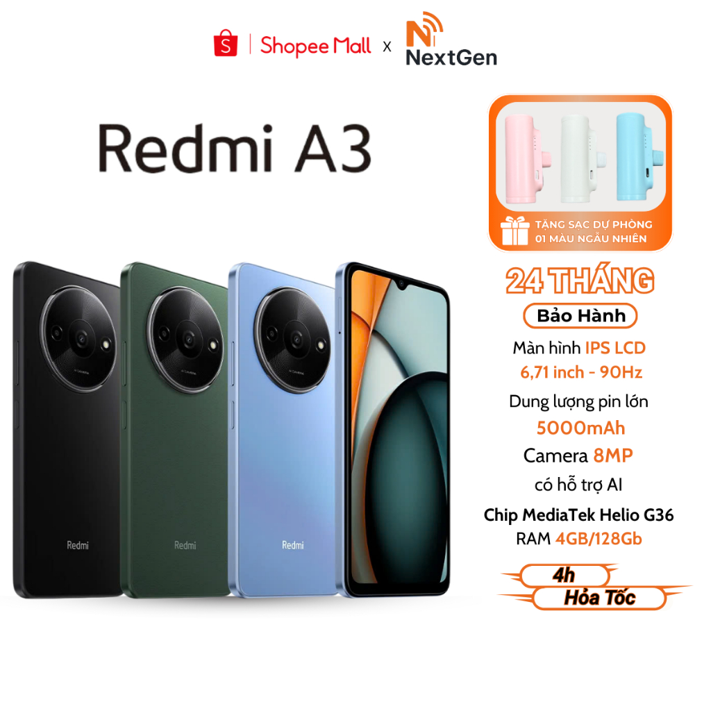 Điện Thoại Thông Minh Xiaomi Redmi A3 3/64GB - 4/128GB Quốc Tế - Chính hãng bảo hành 18 tháng - ( Nguyên Seal )