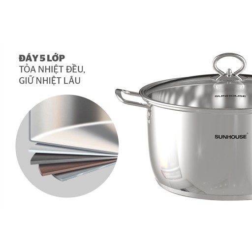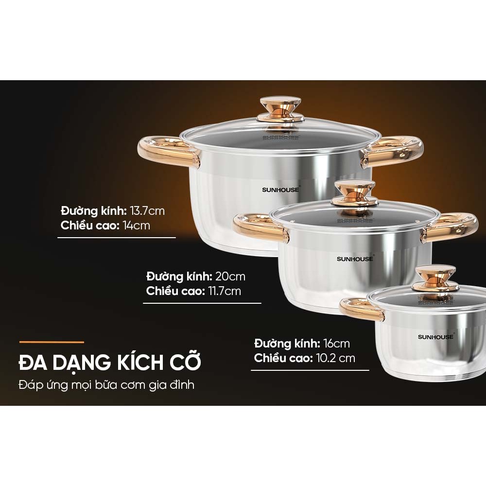 Bộ nồi inox 5 đáy 3 món đáy từ Sunhouse SHG788 - dùng cho mọi loại bếp - Chính hãng