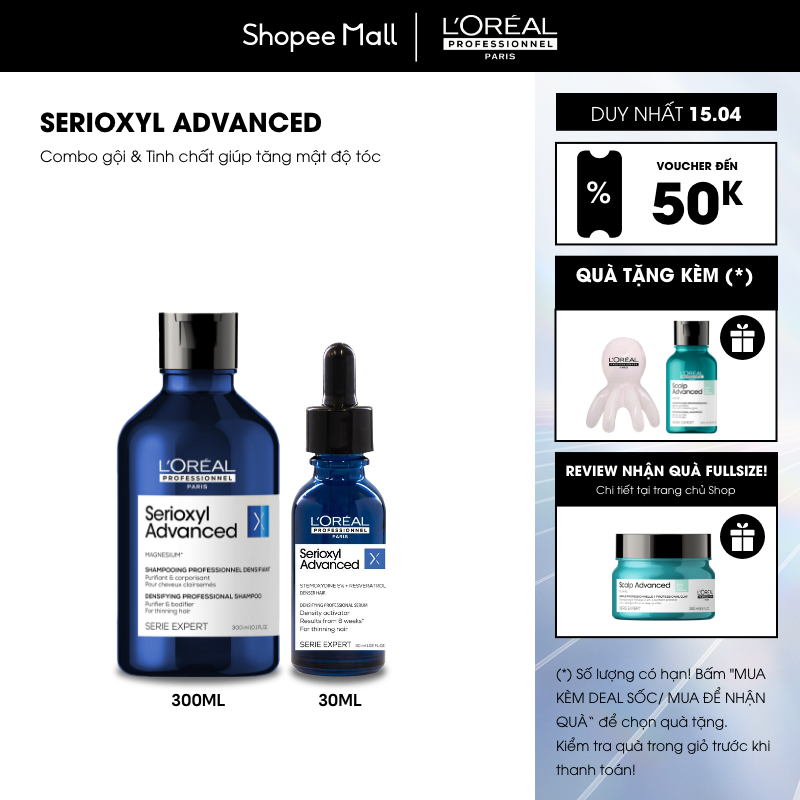 Combo Tinh chất tăng mật độ tóc Serioxyl Advanced 30ml & dầu gội Serioxyl Advanced làm dày tóc chuyên nghiệp 300ml