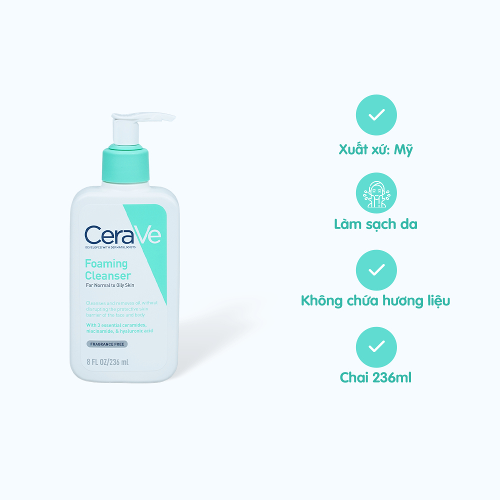 Sữa Rửa Mặt CeraVe Foaming Cleanser 236ml Chính Hãng Cho Da Dầu, Da Khô, Mụn Nhạy Cảm