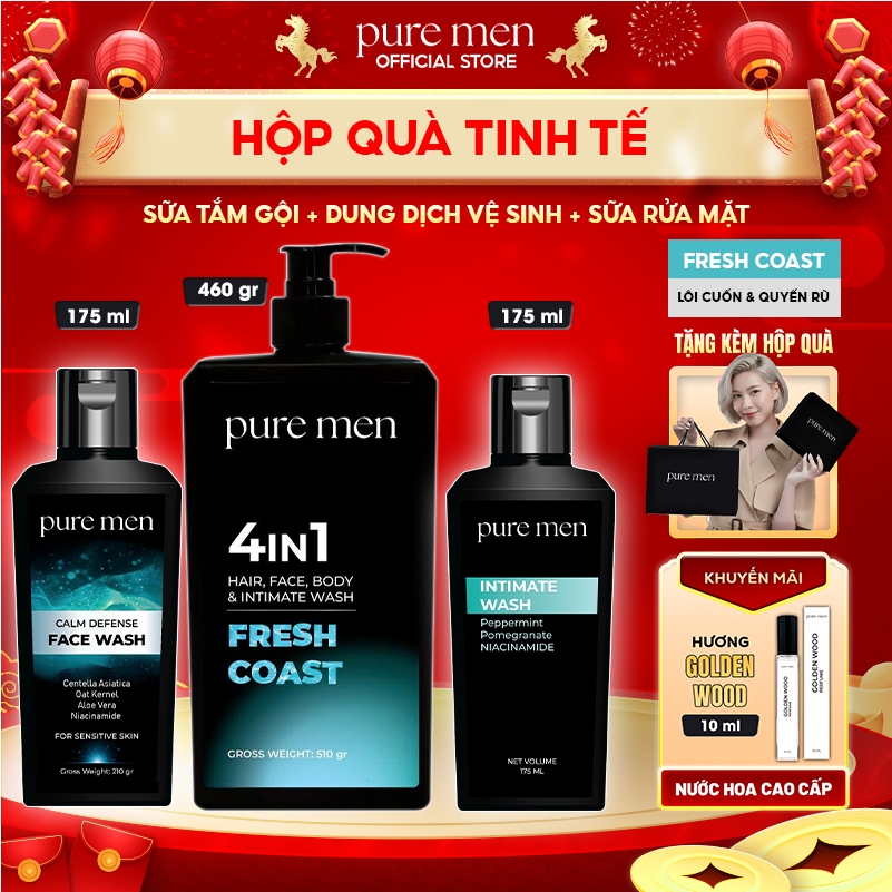 Hộp Quà Tinh Tế Pure Men - Set Bộ Combo Valentine Tặng Bạn Trai - Sữa Tắm Gội & Sữa Rửa Mặt & Dung Dịch Vệ Sinh Nam