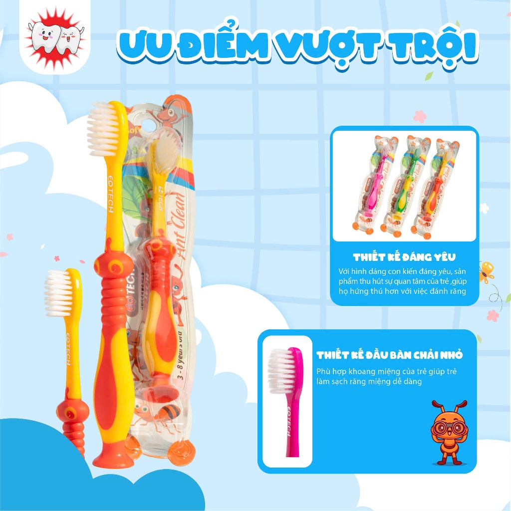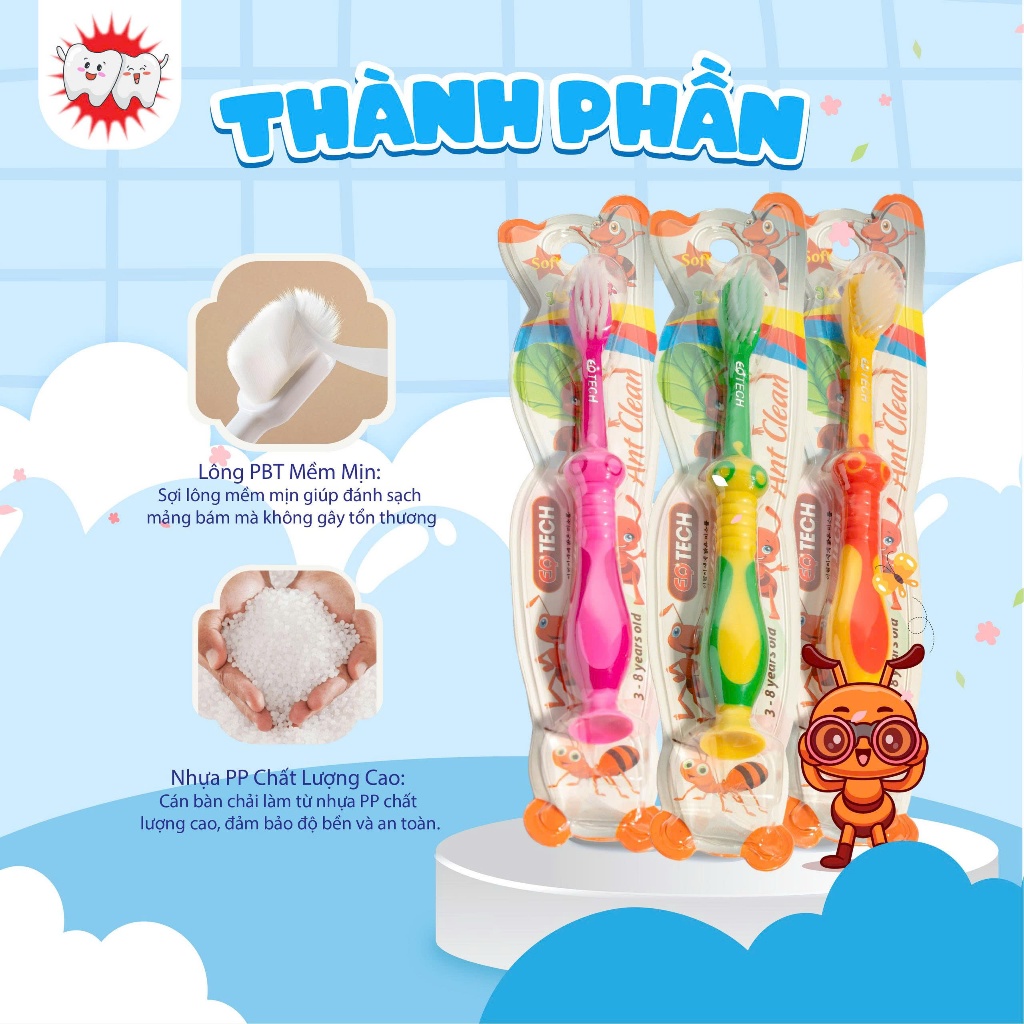 Bàn chải đánh răng trẻ em EQ TECH hình Gấu trúc, Con kiến dễ thương, sợi lông mềm an toàn cho bé tập đánh, đế đứng được