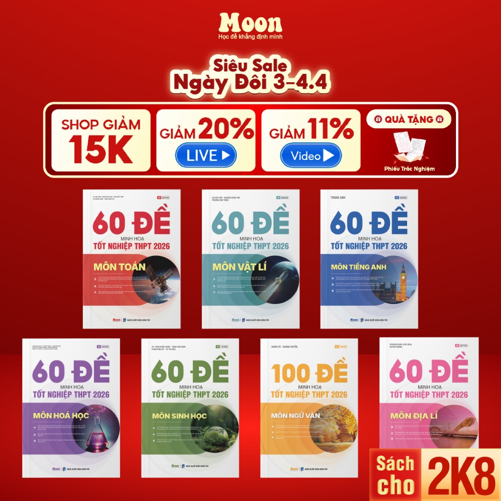 Sách bộ đề minh hoạ ôn thi THPT 2026 môn Toán, Lý, Hoá, Sinh, Anh, Văn, Sử, Địa Moonbook