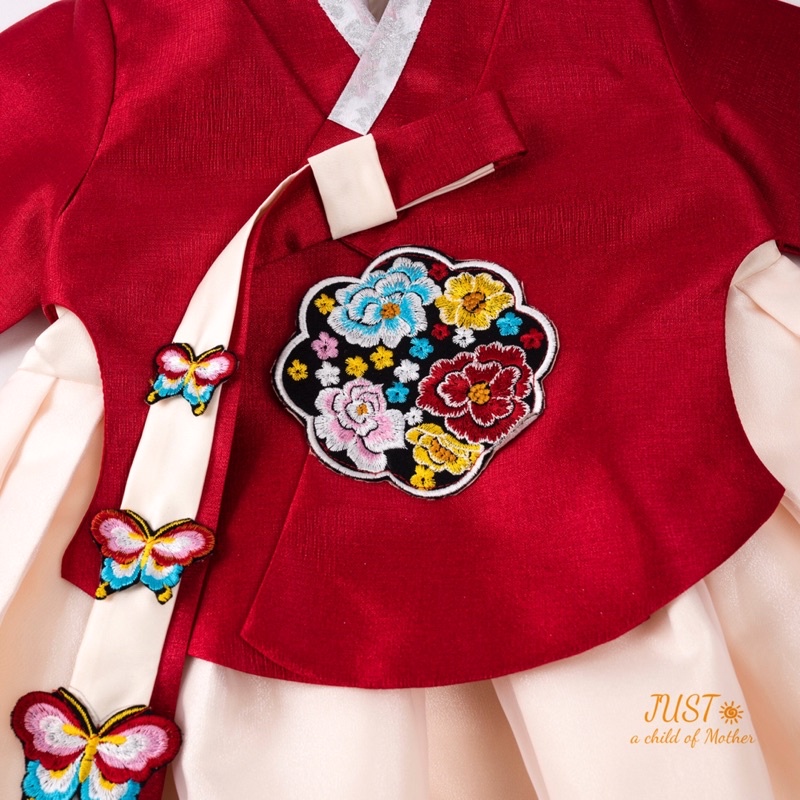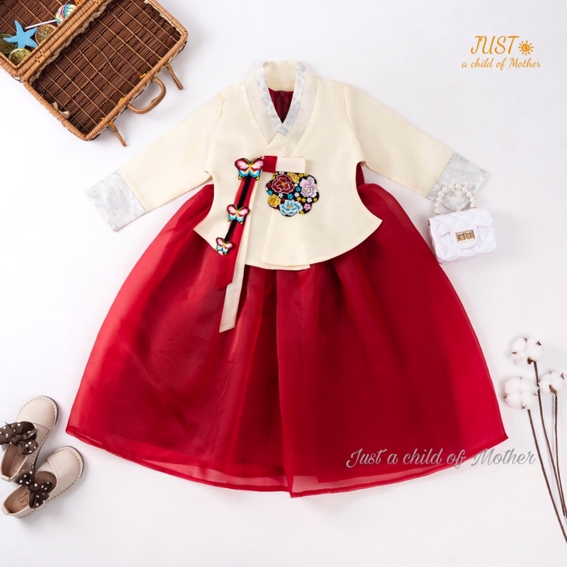 Hanbok Kkoch Jasu cho bé gái,Trang phục truyền thống thêu hoa,Vải Tafta phủ voan
