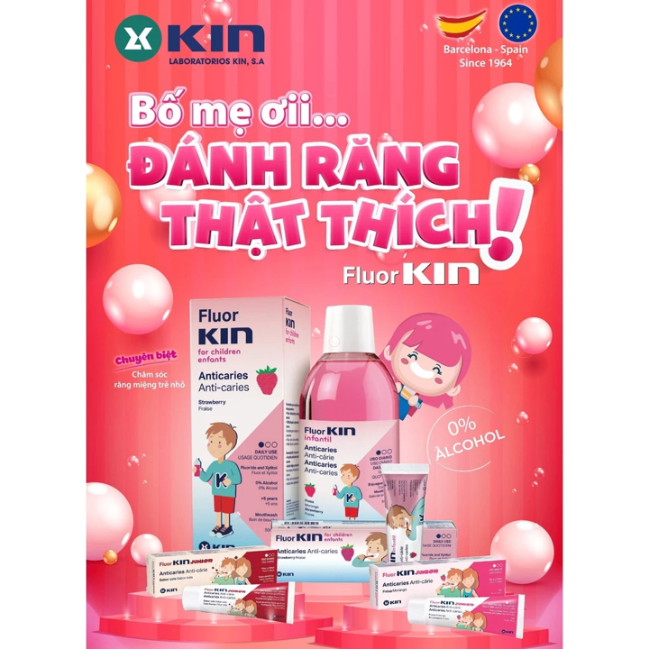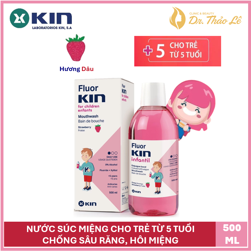 Nước Súc Miệng Hương Dâu Cho Bé Từ 5 Tuổi Fluor KIN Infantil Chống Sâu Răng, Hôi Miệng 500ml