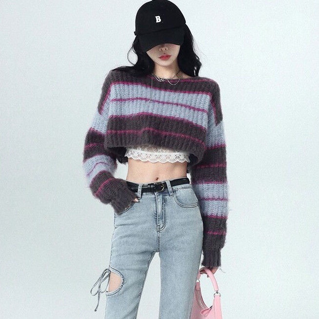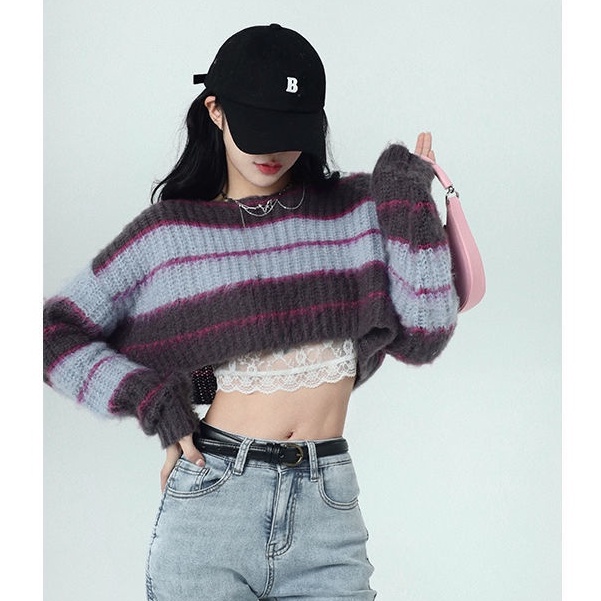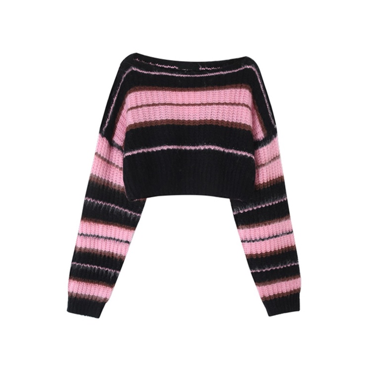 Áo sweater Porozi dệt kim tay dài dáng rộng họa tiết kẻ sọc phong cách hàn quốc cho nữ