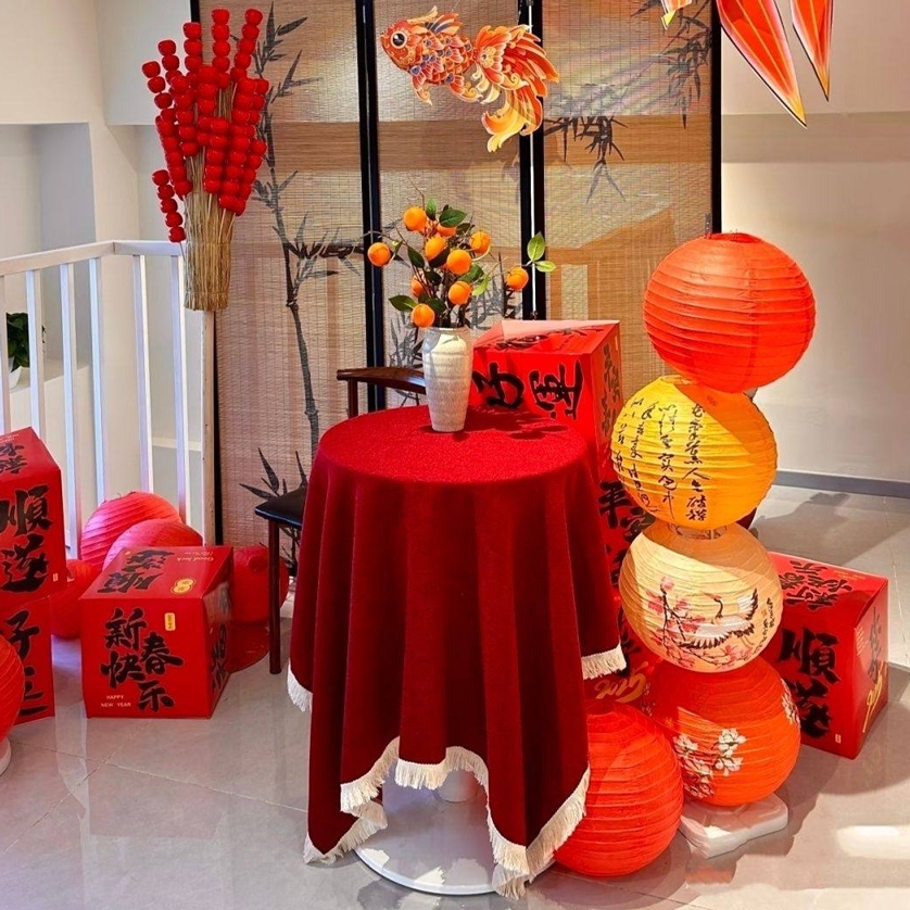 Khăn trải bàn trang trí tết Bính Ngọ 2026, khăn trải bàn nhung Tết, vải con công, TiTi Decor