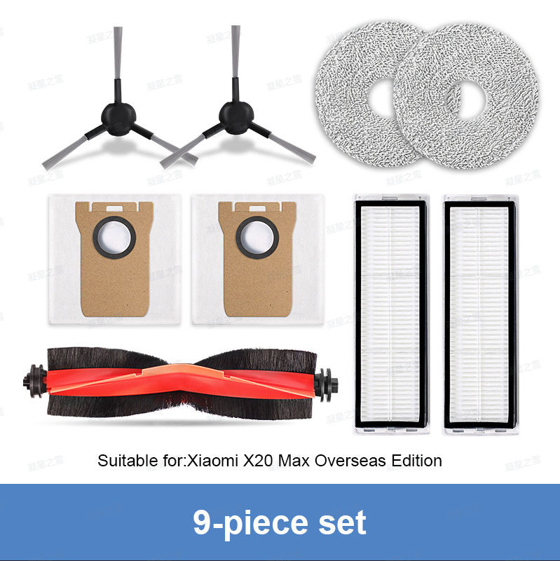 Phụ kiện thay thế cho Xiaomi X20 Max/D109GL bao gồm chổi chính, chổi cạnh, bộ lọc HEPA, khăn lau và túi bụi.