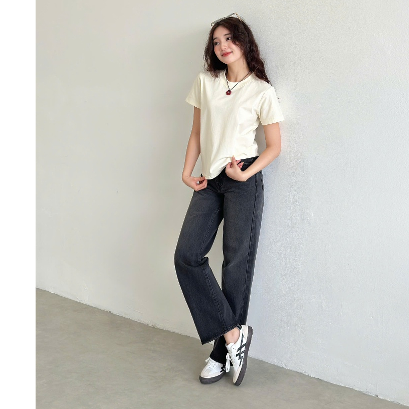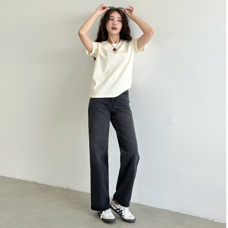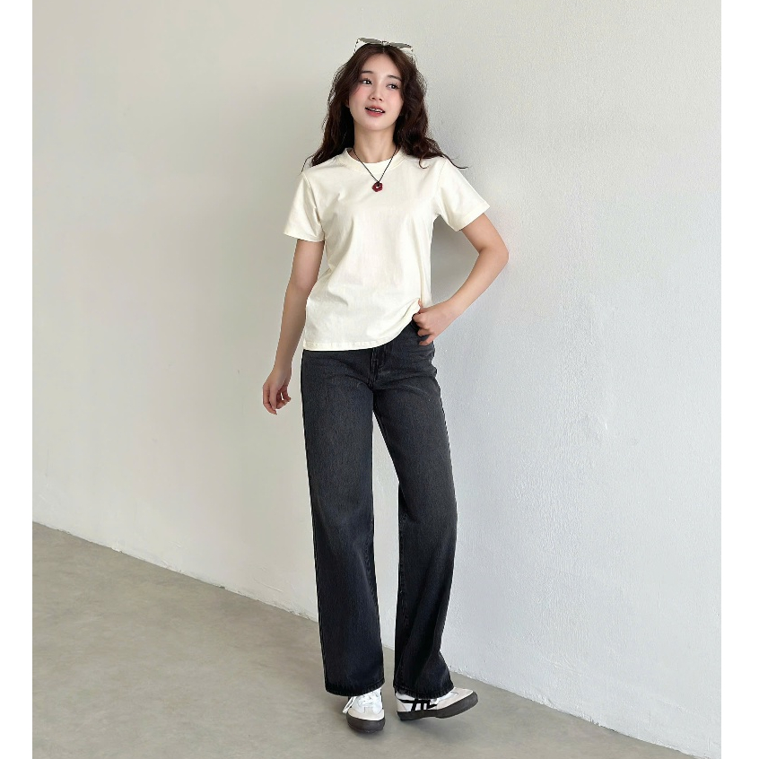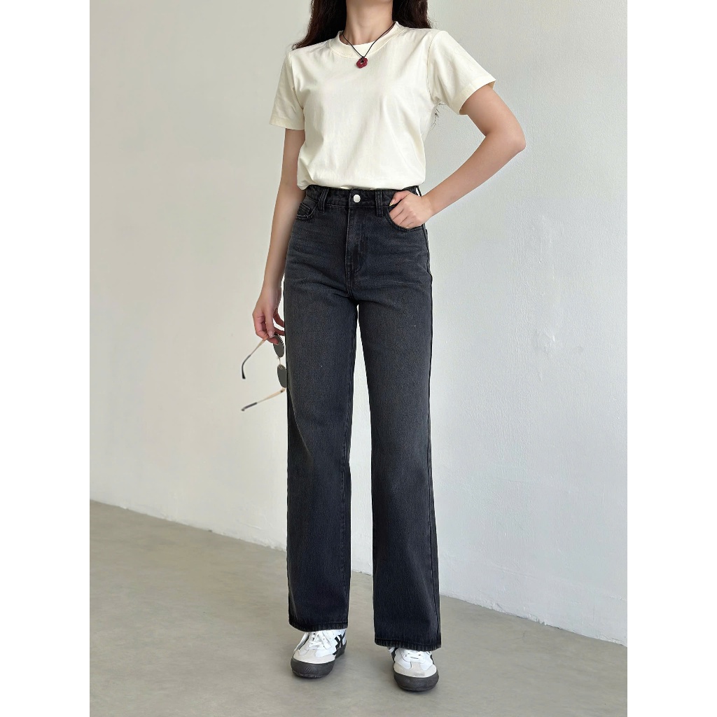 Quần Jean Nữ REDE L-07C Ống Suông Rộng Vừa, Lưng Cao Đứng Form, Màu Đen Wash Râu Mèo Hông/Đùi