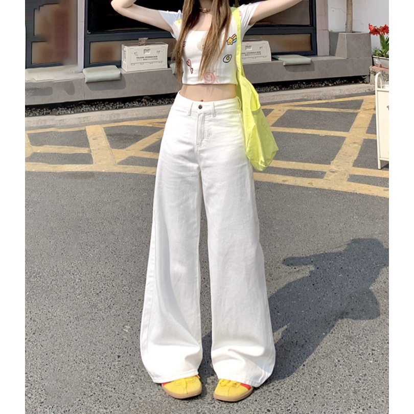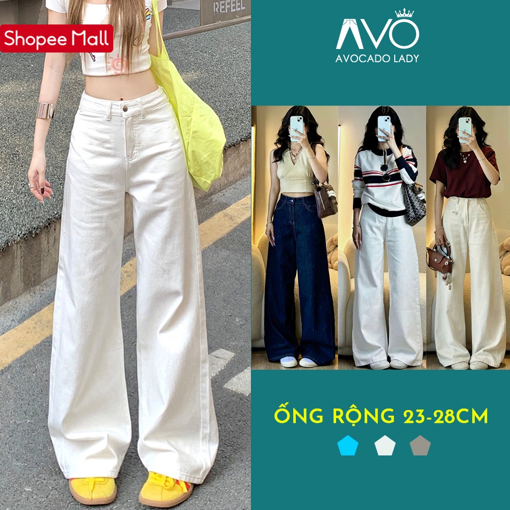 Quần Kaki Nữ trơn Cạp Cao Jean Trắng ống rộng dáng suông đứng Avo Avocado chất Kaki Bò Dáng dài Lưng Cao