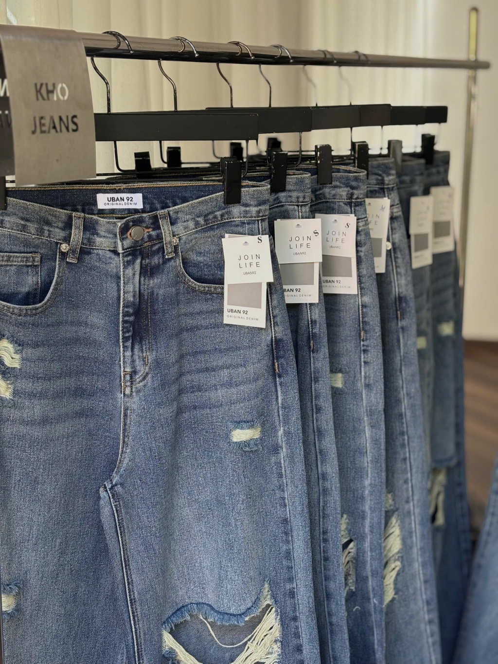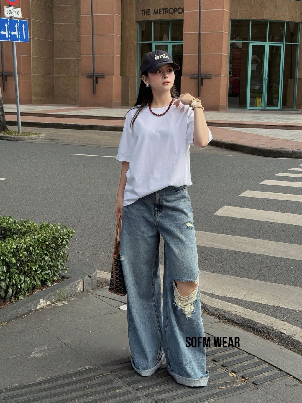 Quần jean nữ ống rộng rách gối DIRAK vải mềm cạp ngang/dưới rốn