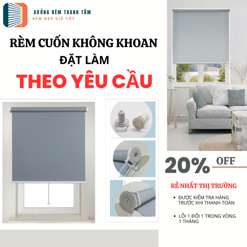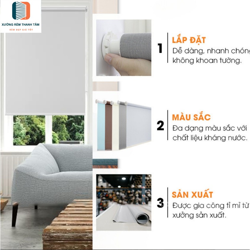 Rèm Cuốn Cửa Không Khoan Cản Sáng 100%, Cách Nhiệt 80%, Chống nước (Đặt Hàng Theo Kích Thước Riêng)