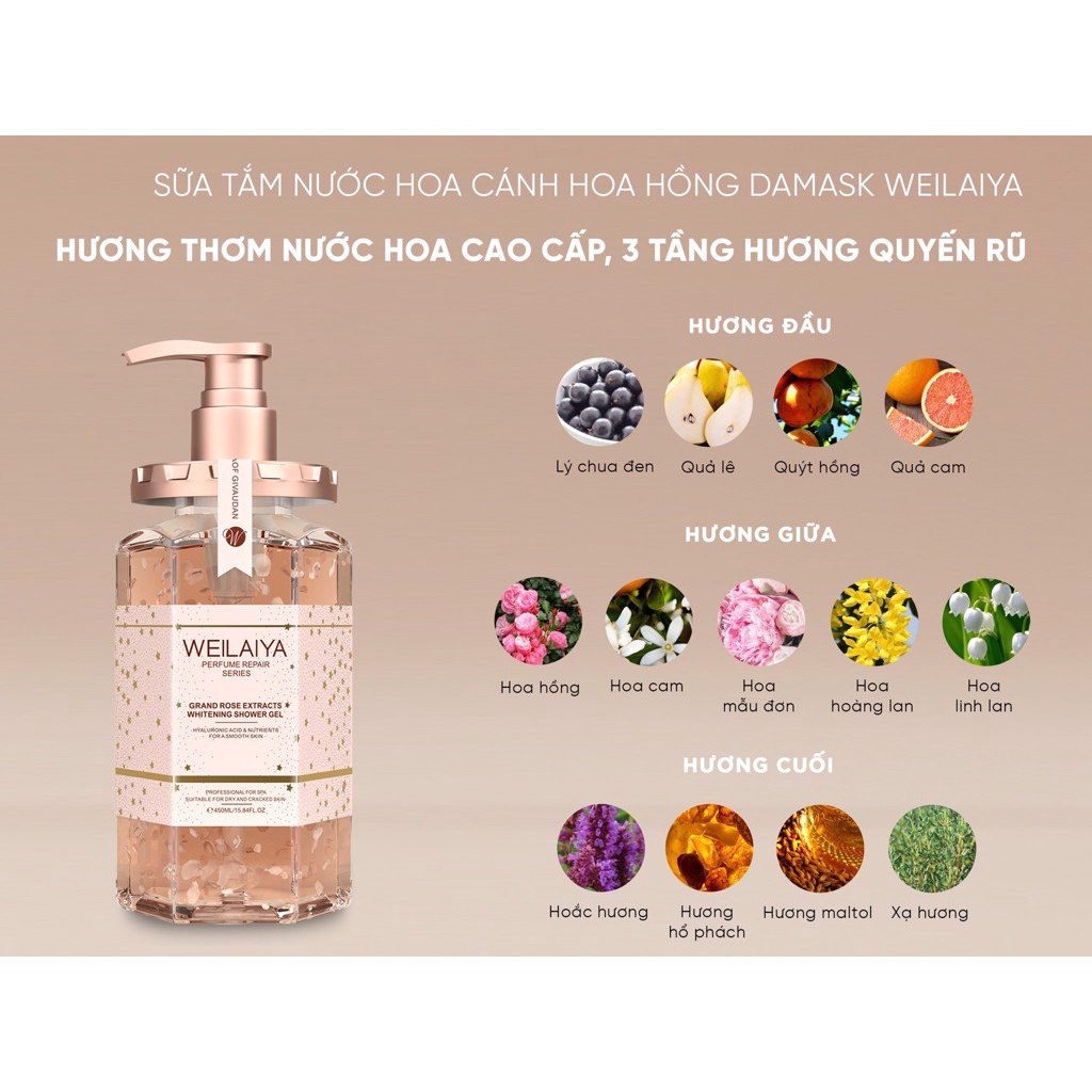 Sữa tắm nước hoa thơm lâu Weilaiya tinh chất tủy mật hoa hồng DaMask - hương thơm quyến rũ - 450ml