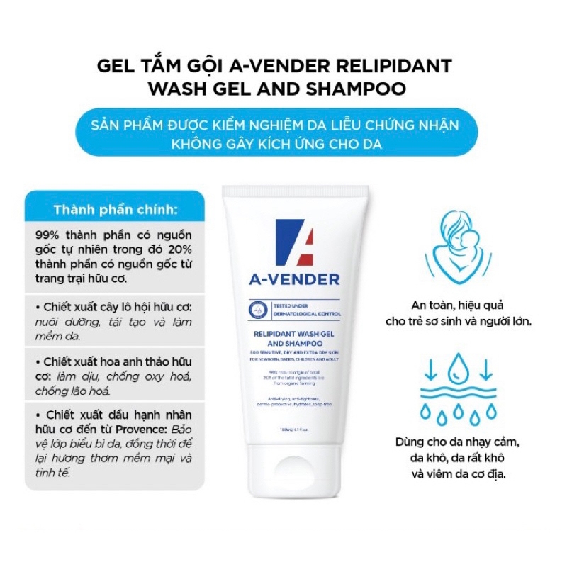 Dầu gội, tắm dưỡng ẩm da đầu A-Vender Relipidant wash gel and shampoo làm sạch làm dịu da
