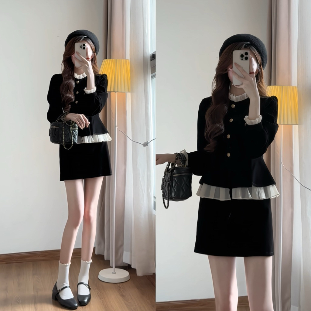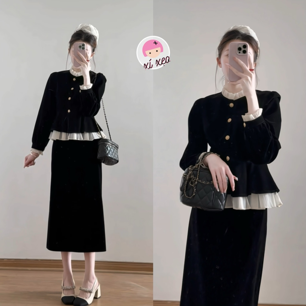 Set áo nhung XIXEOSHOP kèm chân váy dáng dài ngắn tiểu thư - S35