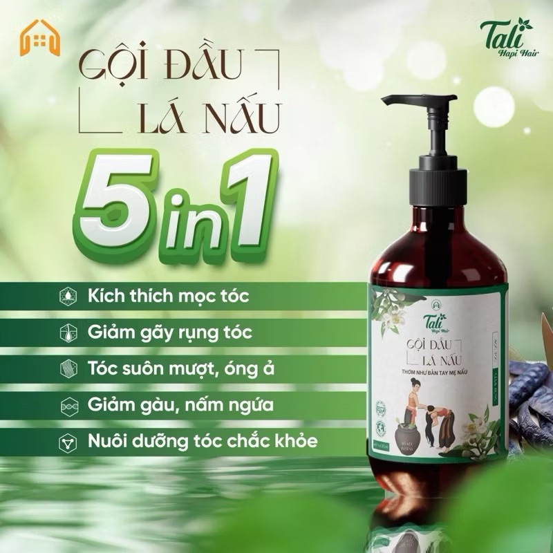 Dầu gội LÁ NẤU TALI 5IN1 tinh dầu vỏ bưởi và bồ kết cô đặc, giảm gàu nấm ngứa, giảm rụng, kích thích mọc tóc
