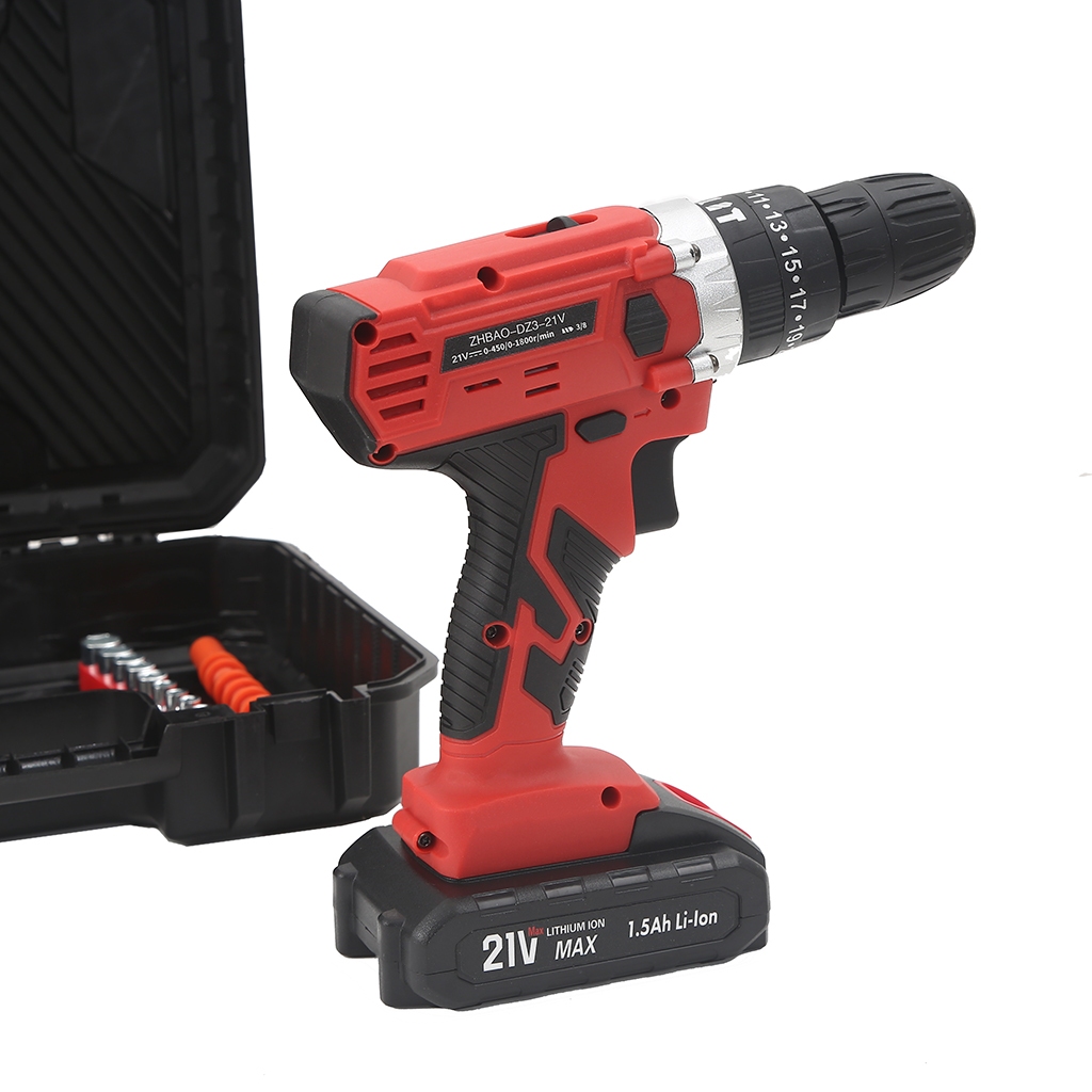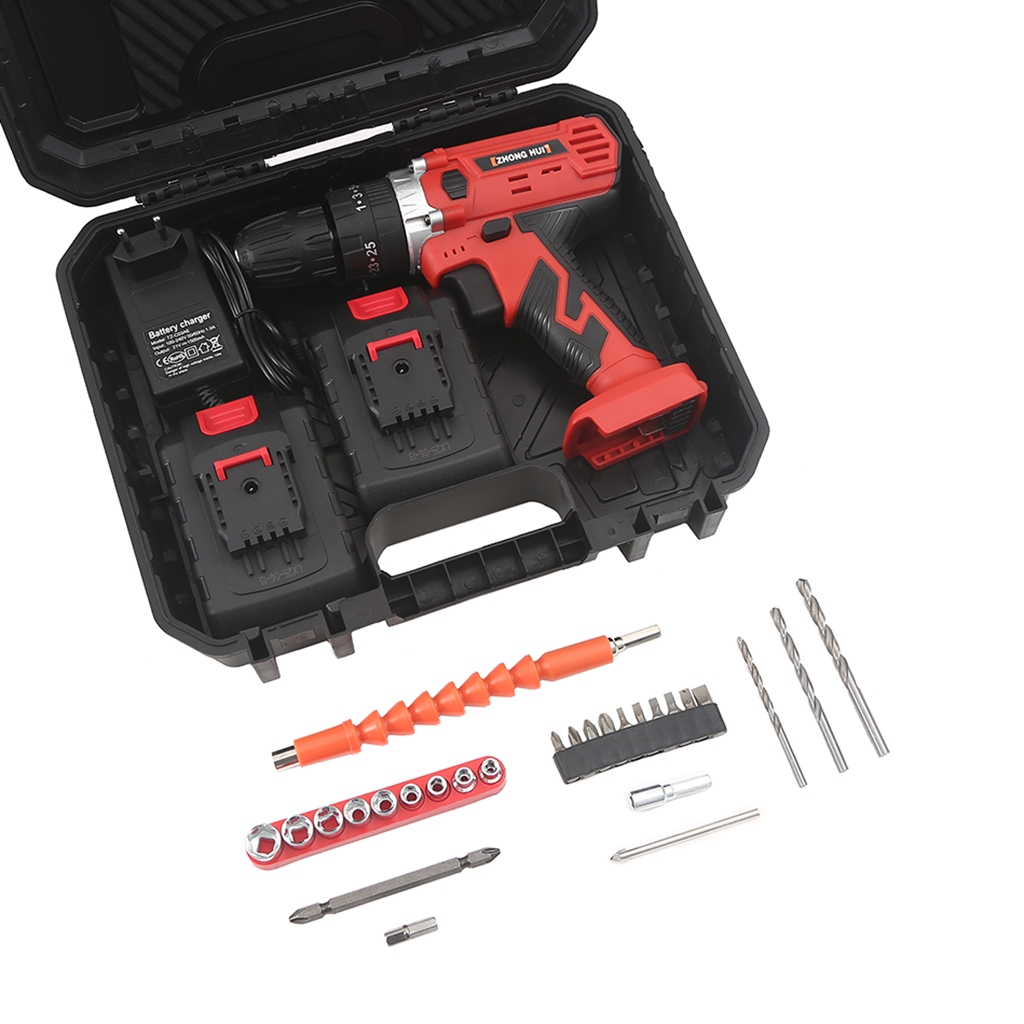 Bộ khoan pin Lithium 50NM (2 pin + 1 bộ sạc) 21V ba chức năng màu đỏ (5 pin) Hộp đựng dụng cụ + (25 món)