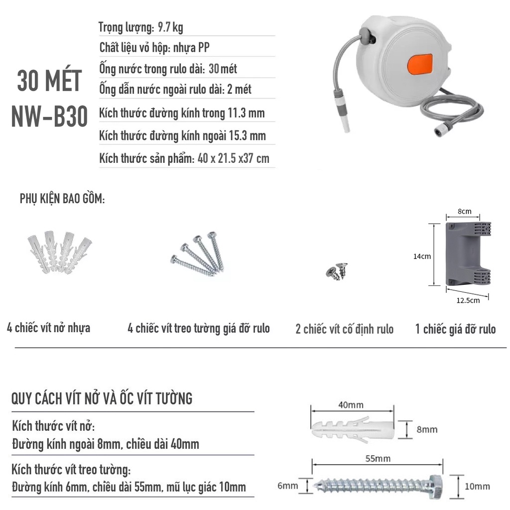 Vòi tưới cây Lionking NW-B. Rulo cuộn ống tự động. Tặng vòi xịt đa năng 8 kiểu phun
