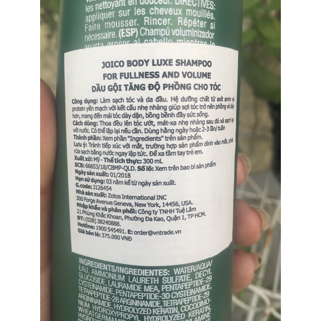 Dầu gội tăng độ phồng cho tóc Body Luxe Shampoo Joico 300ml "