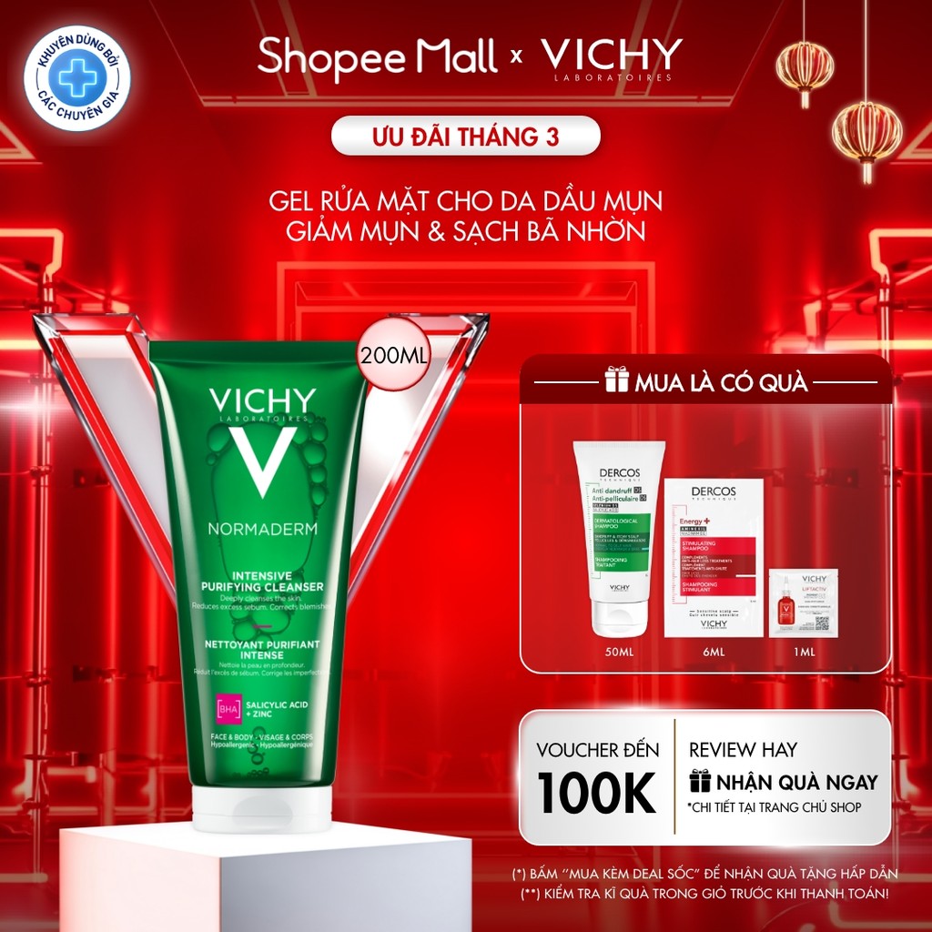 Sữa rửa mặt dạng gel làm sạch sâu giảm bã nhờn Vichy Normaderm Intense Purifying Cleanser 200ml