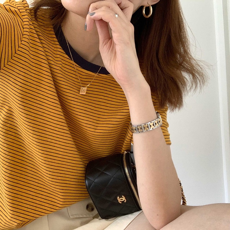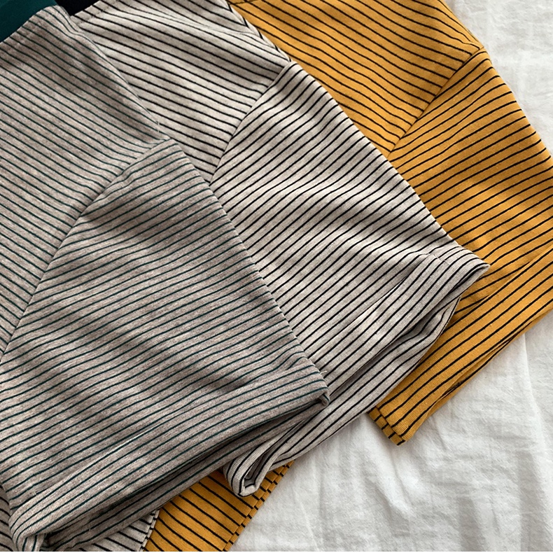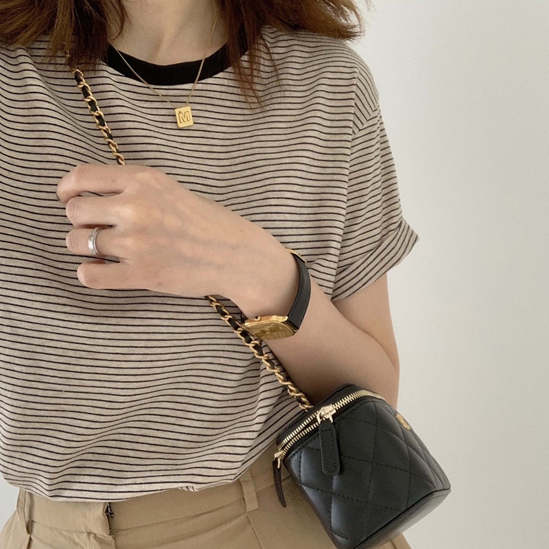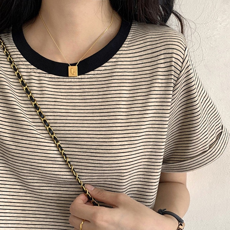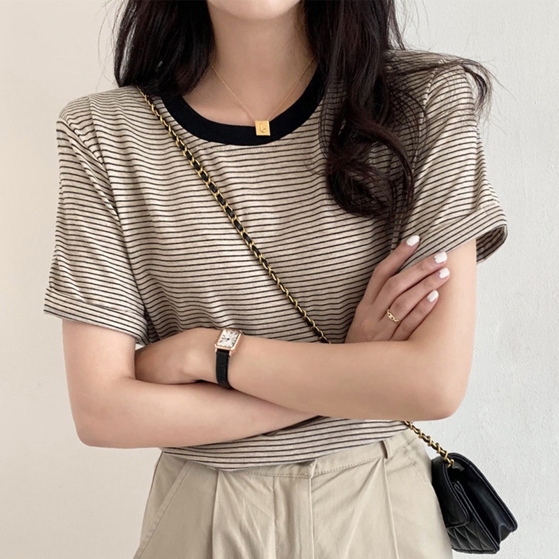 SUXI Áo Thun Nữ Ngắn Tay Cổ Tròn Sọc Ngang Thời Trang