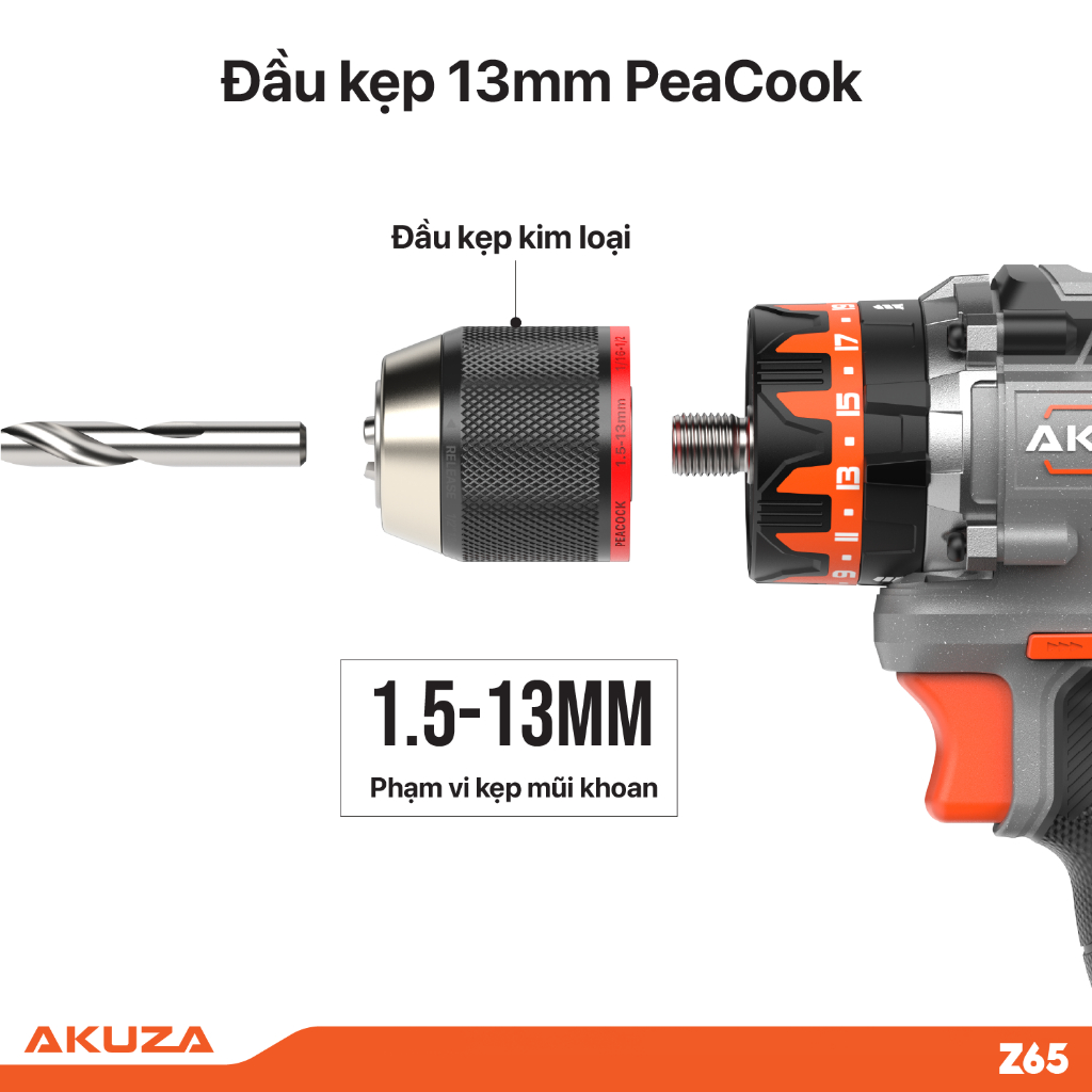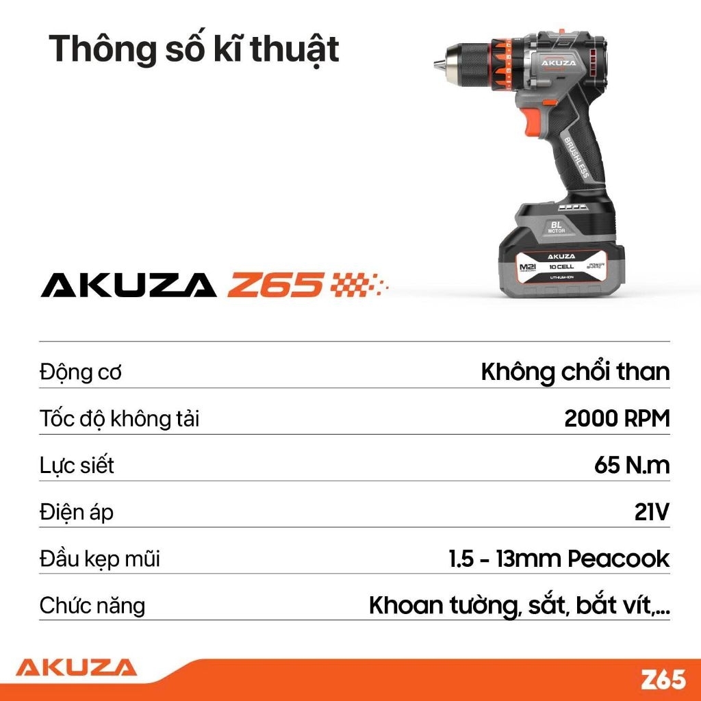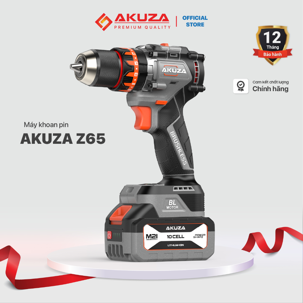 Máy Khoan pin Z65 Akuza - Không Chổi Than, Đầu Kẹp 13mm,Lực 65Nm