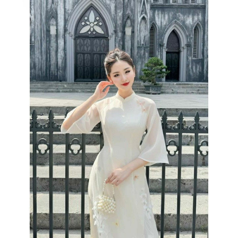 Set Áo Dài Cách Tân Tơ 4 Tà Đính Kết Hoa Trắng Ôm Dáng Đủ Màu Xinh Tươi - Diện Tết Cực Đẹp Cho Các Nàng - Áo Dài Mieso