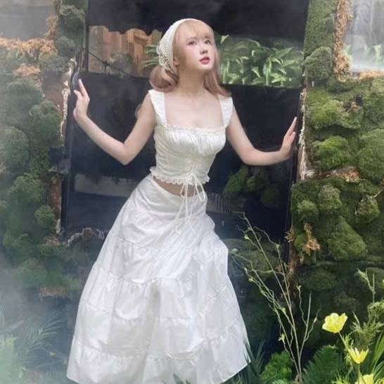 Set đồ đi biển màu trắng,set áo croptop trắng đan dây ngực kèm chân váy trắng rút dây eo 5 tầng xoè cho nàng đi du lịch