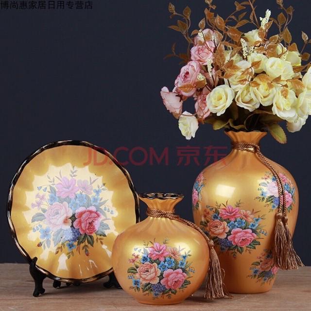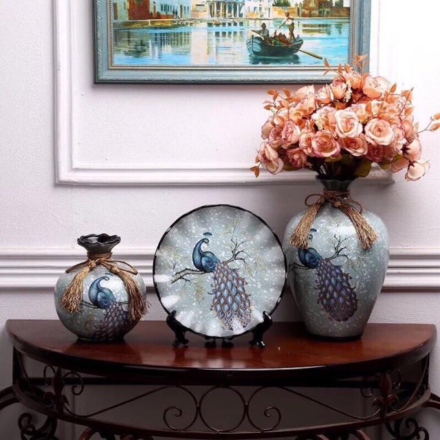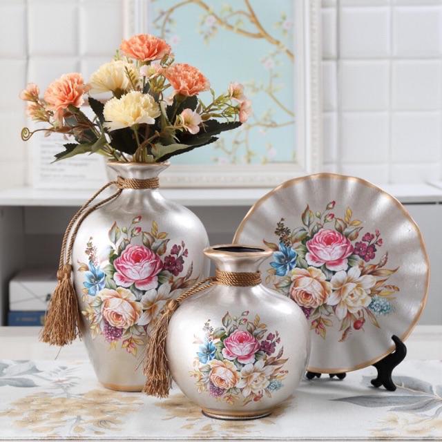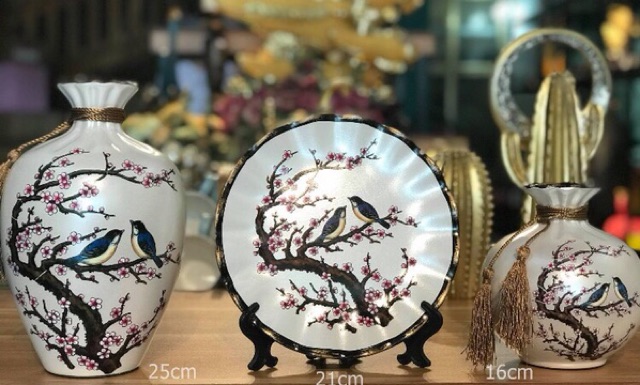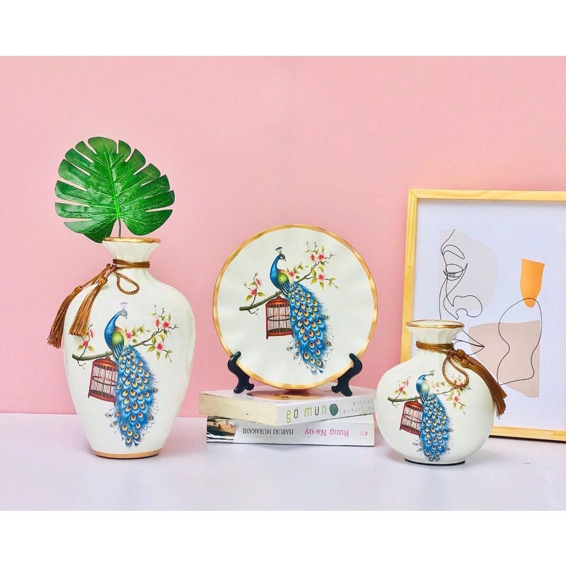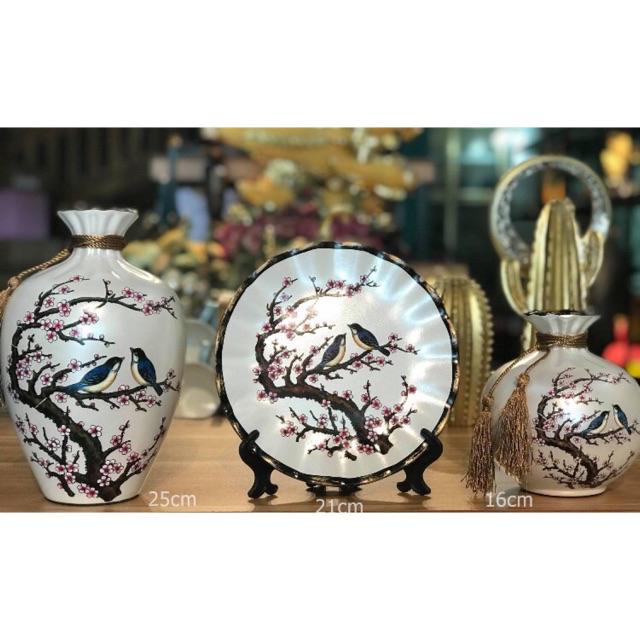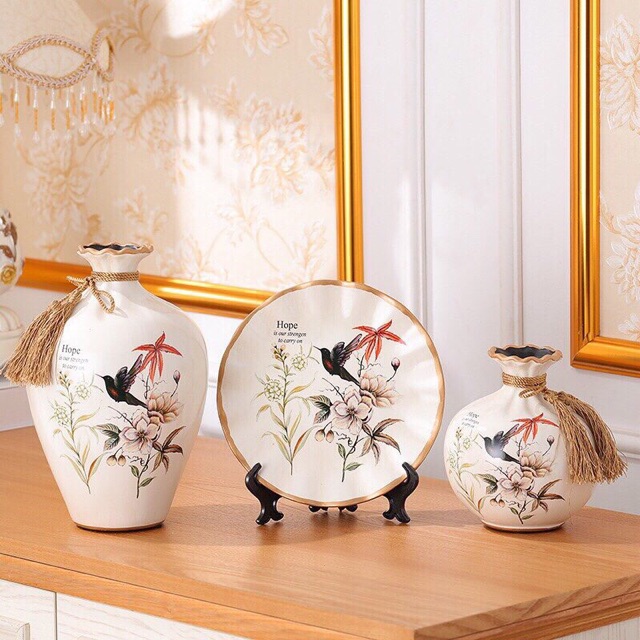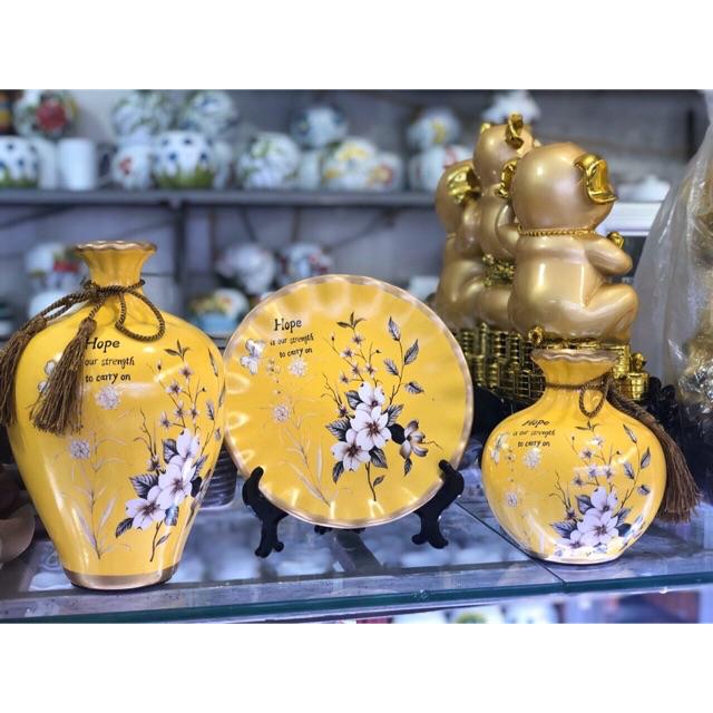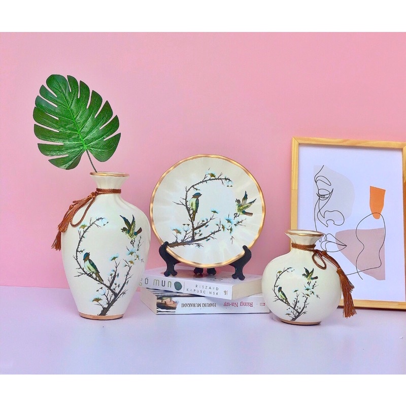 Set 3 bộ lọ và đĩa decor trang trí bằng gốm sứ kèm kệ kê đĩa