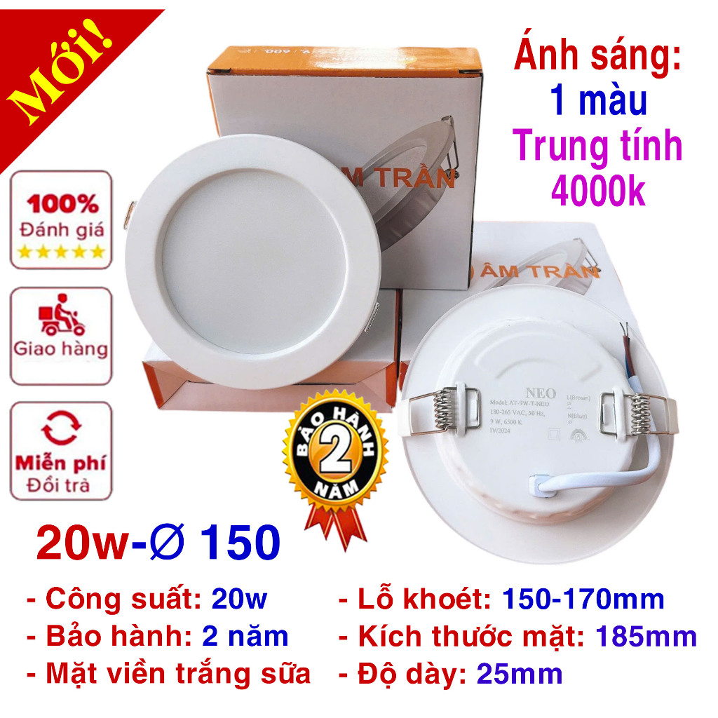 Đèn led âm trần 9w (phi 90mm), 12w (phi 110mm), 20w (phi 150-170mm)/ Ánh sáng: 3 màu,1 màu