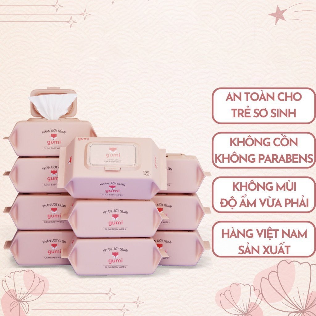 Thùng 10 gói khăn ướt,1 gói 100 tờ,GUMI KHÔNG CỒN,không parabens,AN TOÀN CHO TRẺ SƠ SINH